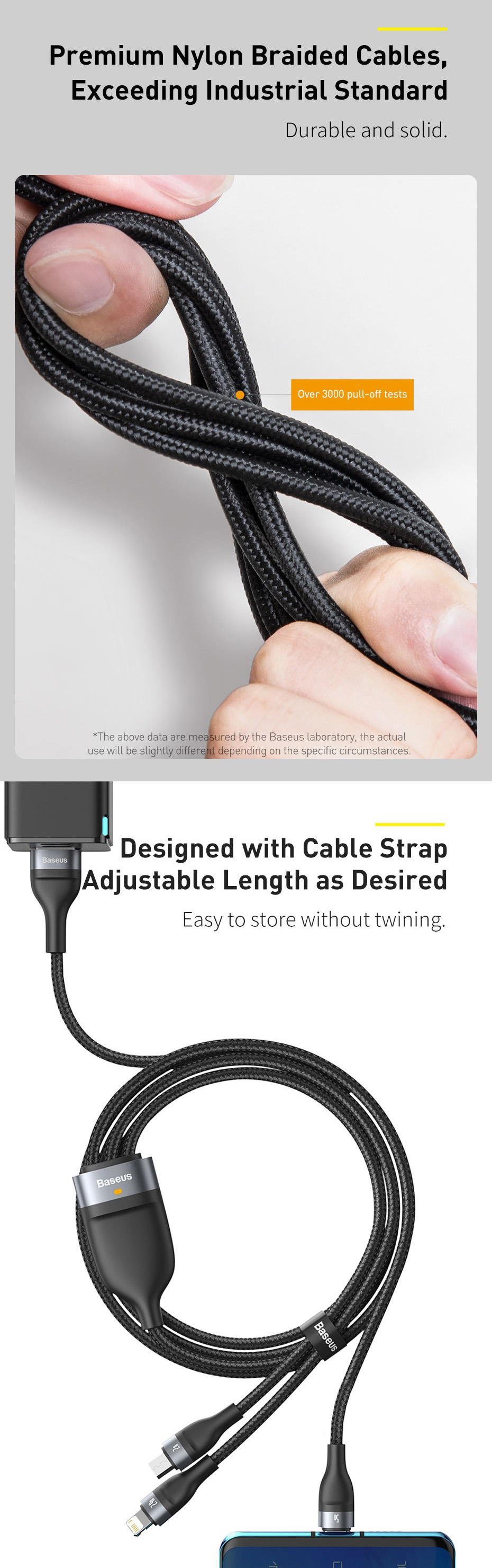 ✨Cáp sạc đa năng 3 đầu Baseus 40W, Cáp sạc nhanh 3 đầu Baseus Flash Series 3in1 (USB to Type C/ Lai-nin/ Micro, 5A/40W) - Hàng chính hãng