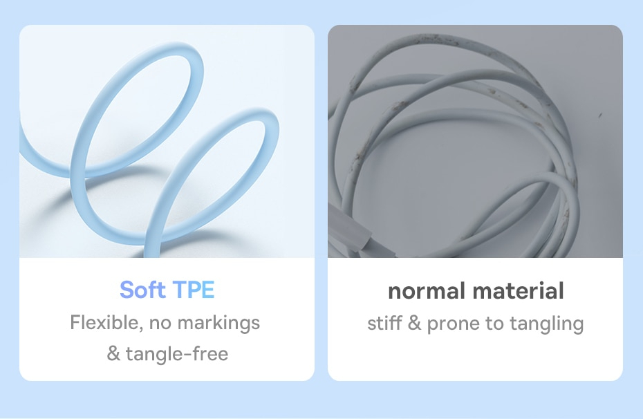 Sản phẩm được làm bằng chất liệu TPE (Thermoplastic Elastomer) để tăng tính linh hoạt và độ bền của sản phẩm. TPE là một loại chất liệu có tính chất dẻo và đàn hồi cao, giúp sản phẩm có thể uốn cong, xoắn và gập ngang dọc lên đến 20000 lần mà không làm gãy hoặc rối dây.