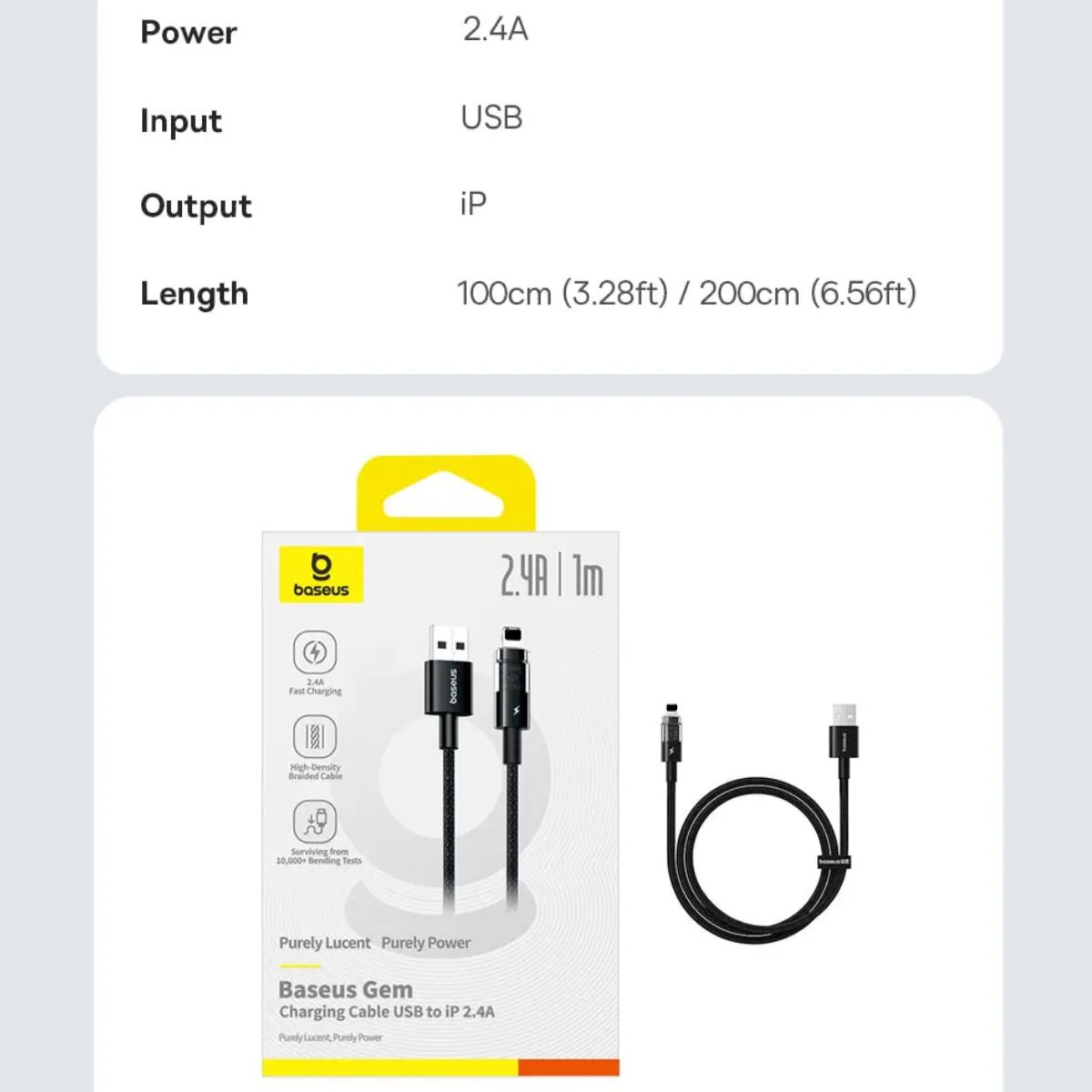Giới thiệu Cáp sạc nhanh và truyền dữ liệu Usb to Light-ning 2.4A Baseus Gem Charging Cable dài 1M và 2M - Thương hiệu: Baseus - Công suất: 2.4A - Truyền dữ liệu: 480 Mbps - Input: USB - Ouput: Light-ning - Màu sắc: Đen
