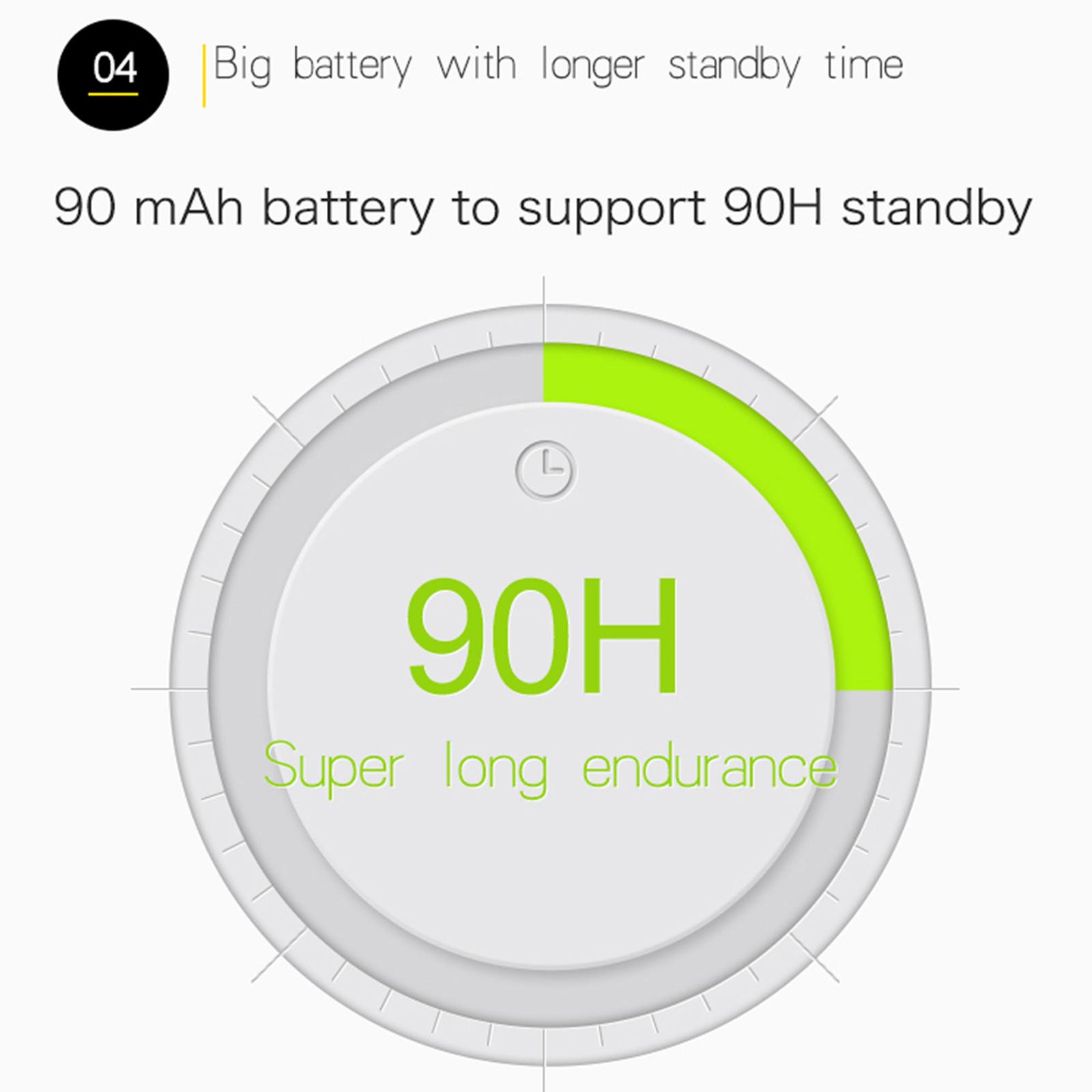 Built-in rechargeable 90mAh battery provides up to 6 hours of talking time, 5 hours of music time and about 90 hours of standby time.