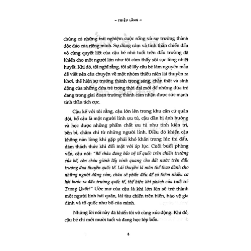 Trải qua quá trình luyện tập theo chế độ vô cùng khắt khe của người bố, cậu bé đã vượt qua nỗi sợ đối với biển cả và trở thành nhà vô địch Giải Lái thuyền thế giới dành cho thiếu niên.“Tôi nghĩ rằng cuộc đời cũng vậy. Cuộc đời của mỗi người đều giống như một chuyến đi biển. Có lúc trời yên biển lặng, có lúc biển động sóng lớn, không phải lúc nào cũng thuận buồm xuôi gió. Nhưng dù phải đối mặt với khó khăn, nguy hiểm như thế nào, chỉ cần bạn giữ được tinh thần lạc quan và thái độ bình tĩnh thì chắc chắn sẽ có thể giữ được nụ cười tự tin mà vượt qua hoàn cảnh khó khăn, đạp gió rẽ sóng trên biển lớn của cuộc đời.” – Triệu Lăng.