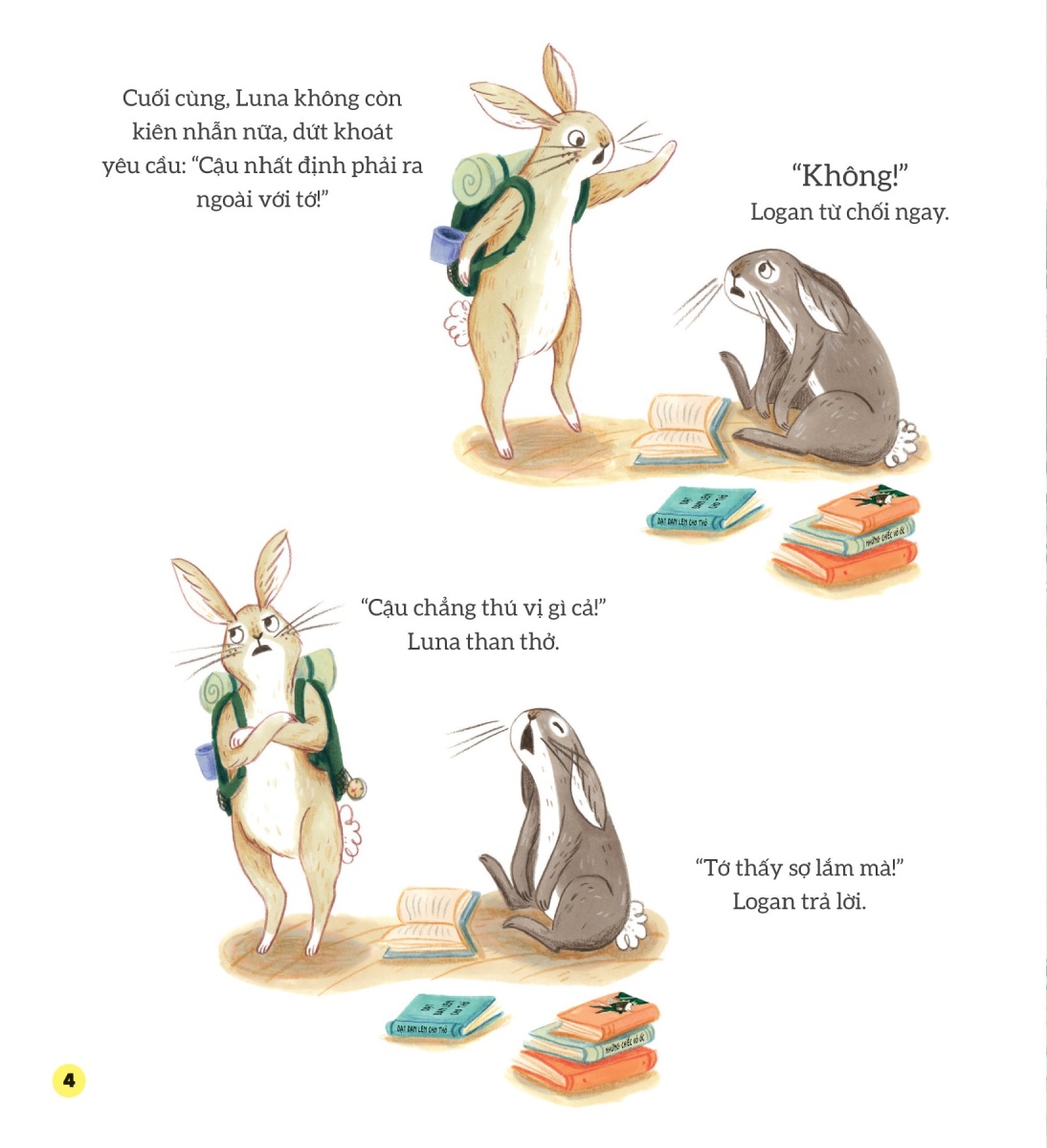 Mua tại TiktokCâu Chuyện Nhỏ, Bài Học Hay - Dũng Cảm Lên Nào! Logan là một chú Thỏ con đáng yêu, nhưng suốt ngày cậu ấy chỉ dám ở ru rú trong nhà. Cậu ấy có một cô bạn Thỏ tên là Luna, một cô Thỏ vô cùng hiếu động. Ngày nào Luna cũng ra ngoài chơi đùa khắp nơi. Việc này nghe có vẻ thú vị, nhưng mà nó cũng khiến Logan cảm thấy có chút sợ hãi đấy.