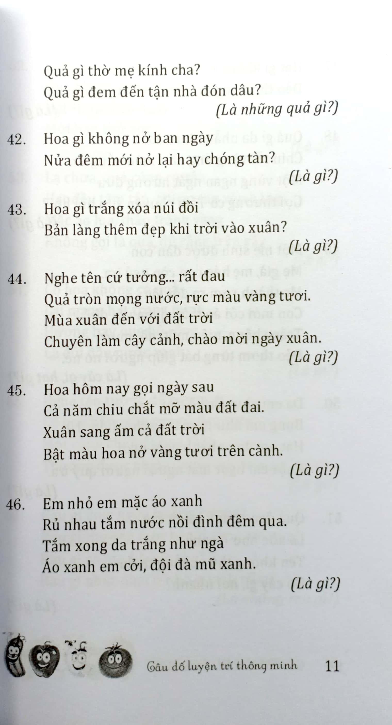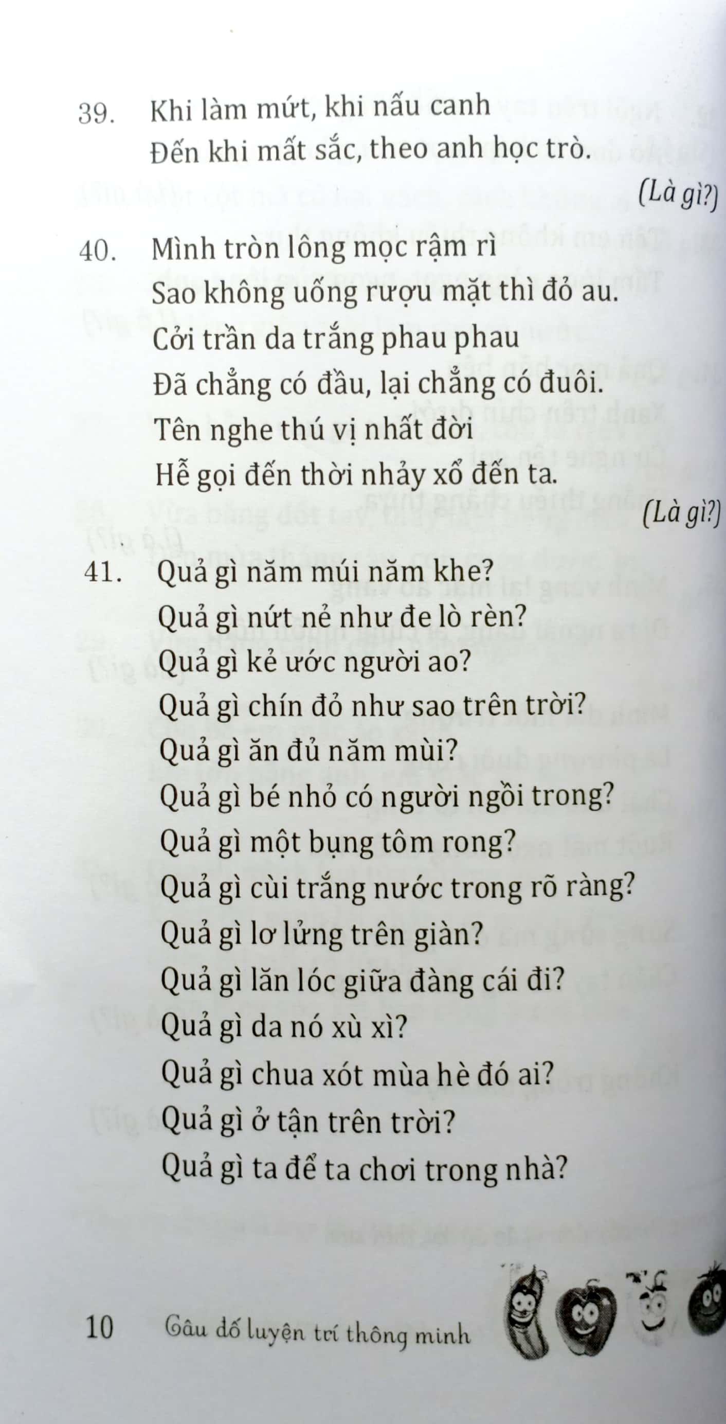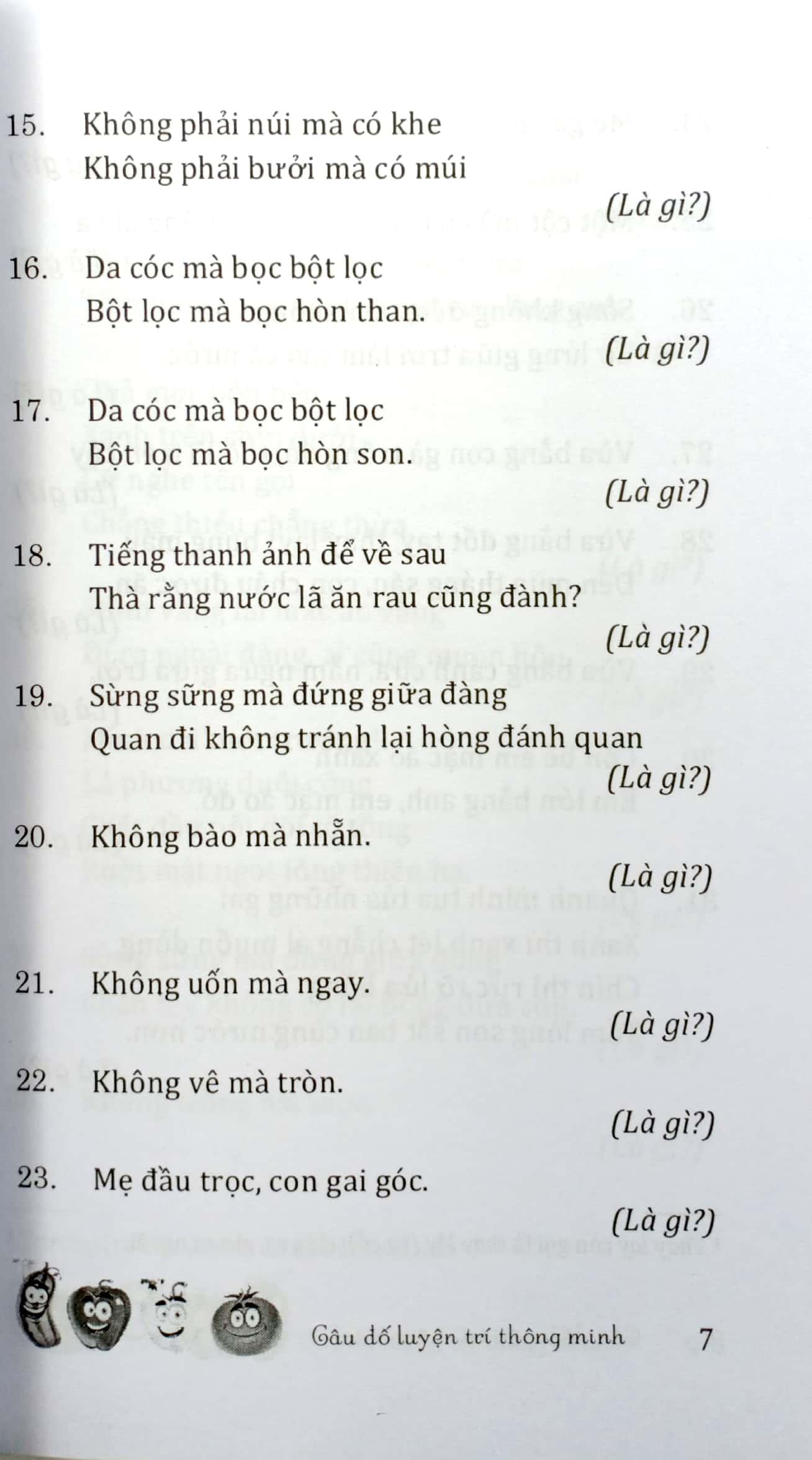 Mua tại TiktokCuốn sách không chỉ đưa ra những câu đố vui mà còn gợi ý tò mò cho các bé, giúp cho các em biết được thêm về thế giới xung quanh mình thông qua những câu đố vui: học mà chơi,chơi mà học như vậy! Bố mẹ hãy đặt câu hỏi và cùng suy luận với con em mình để giúp bé rèn luyện sự nhanh nhạy.