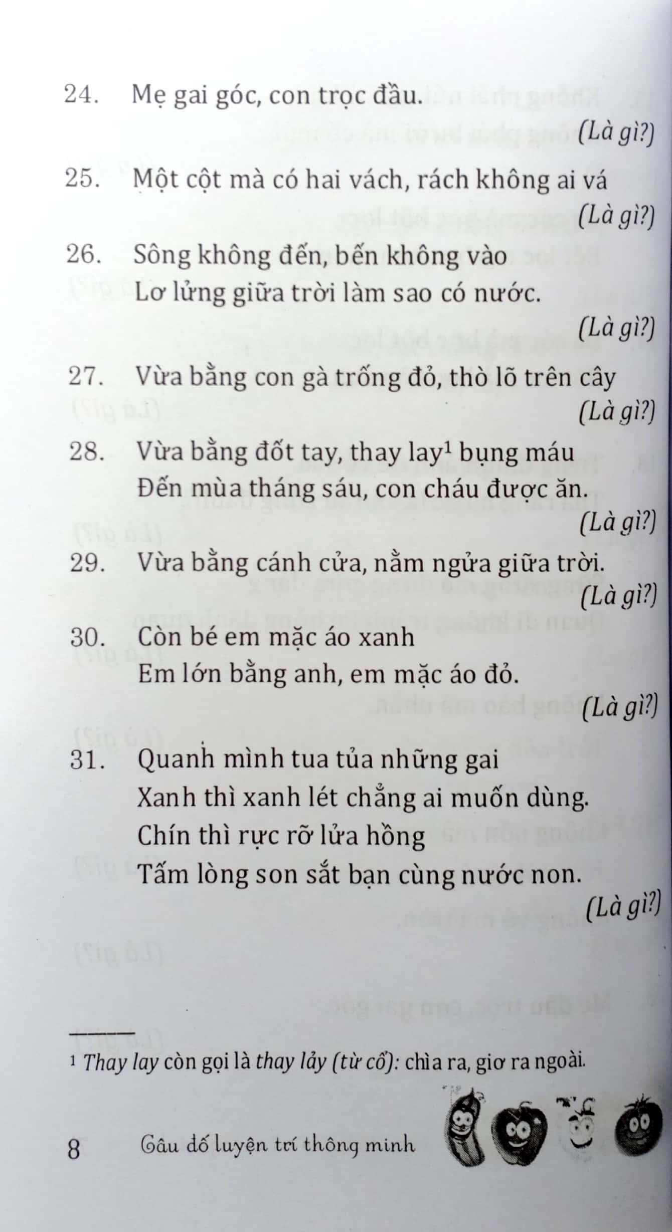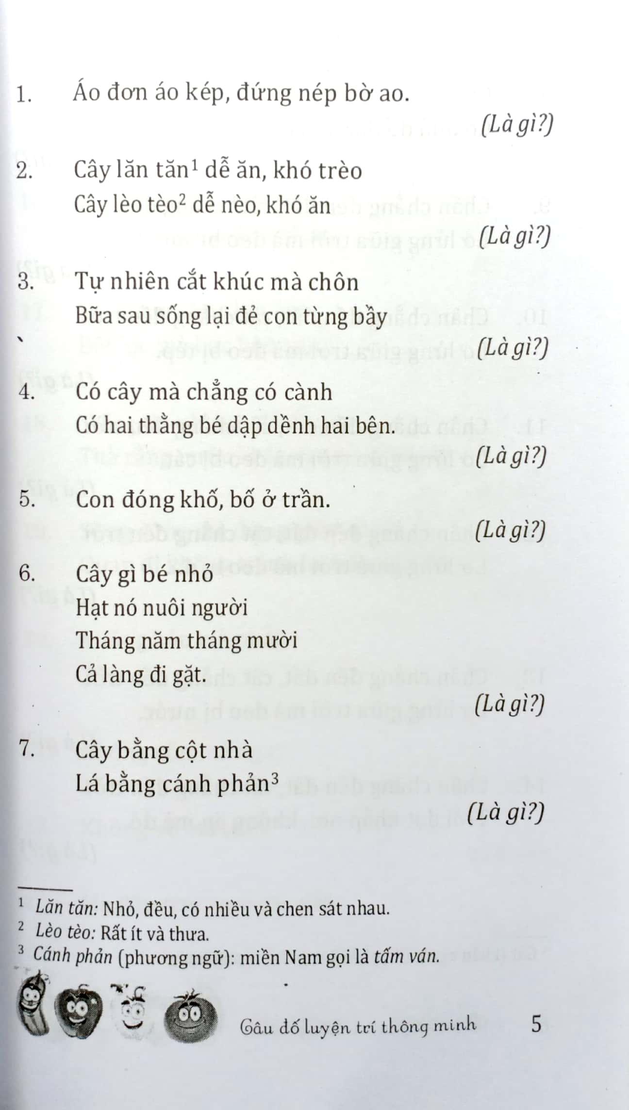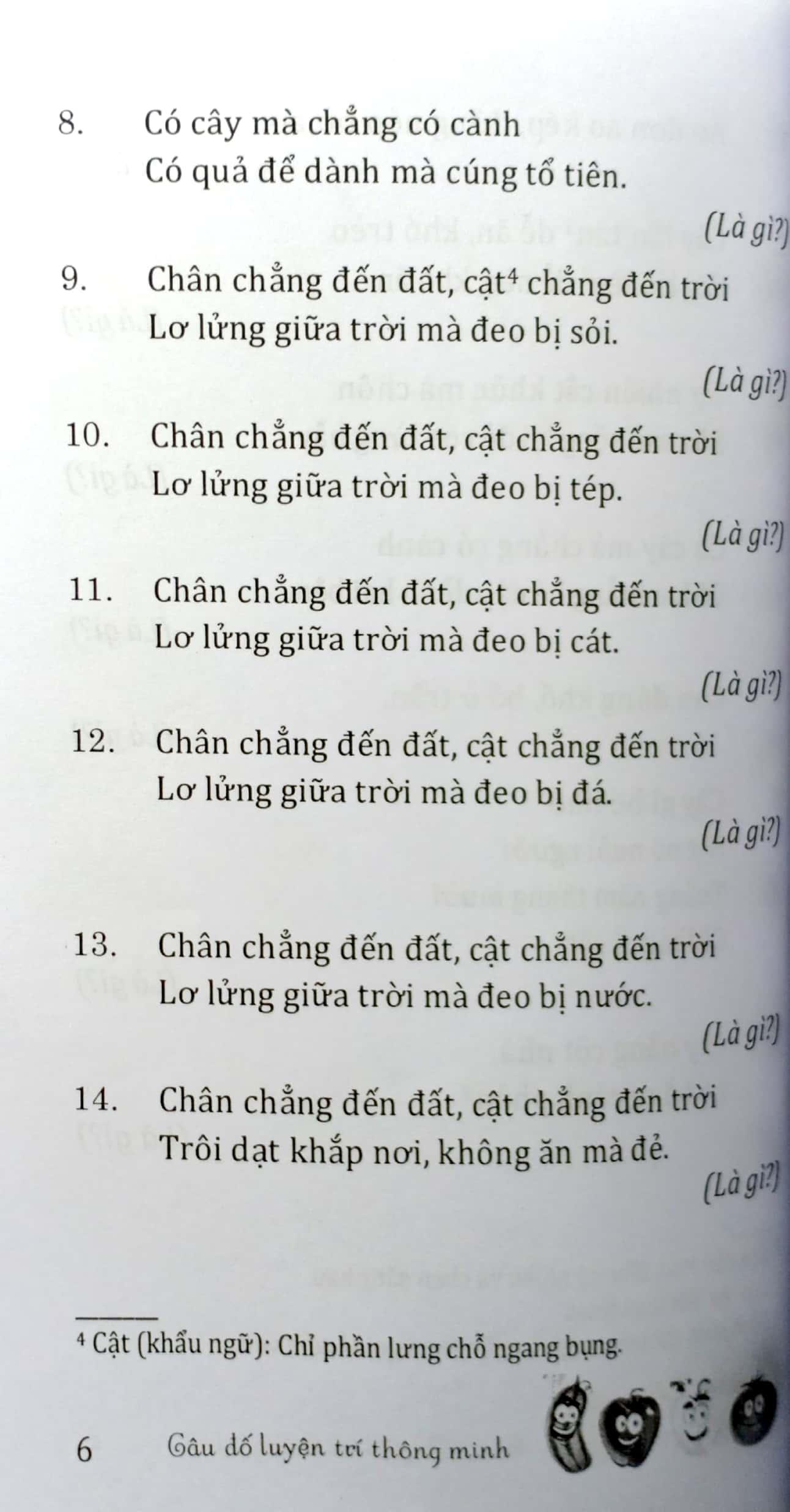 Mua tại TiktokCuốn sách không chỉ đưa ra những câu đố vui mà còn gợi ý tò mò cho các bé, giúp cho các em biết được thêm về thế giới xung quanh mình thông qua những câu đố vui: học mà chơi,chơi mà học như vậy! Bố mẹ hãy đặt câu hỏi và cùng suy luận với con em mình để giúp bé rèn luyện sự nhanh nhạy.