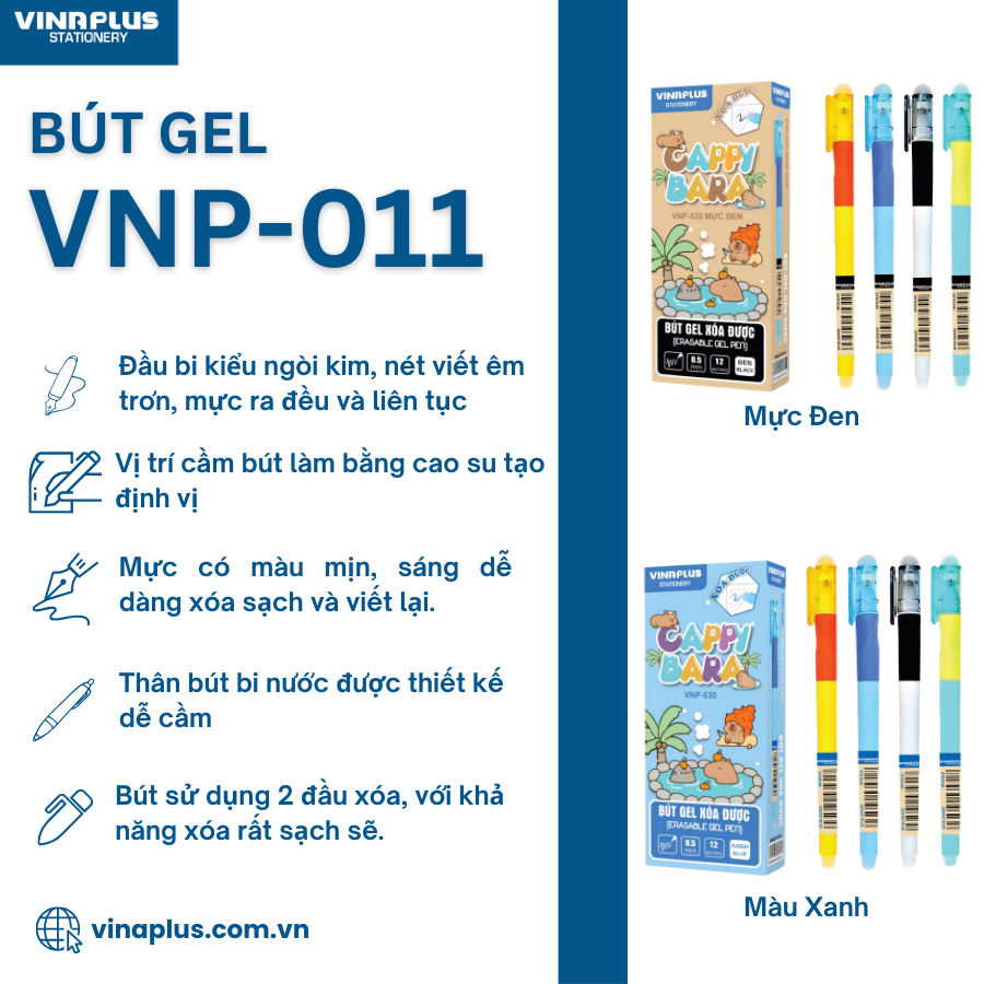 Mua tại TiktokBút gel xóa được Vinaplus VNP-530 với thiết kế vị trí cầm bút làm bằng cao su tạo định vị, giúp cho việc cầm bút của bé đúng cách viết lâu không gây mỏi tay và êm tay không gây chai và đau. THÔNG TIN CHI TIẾT SẢN PHẨM: