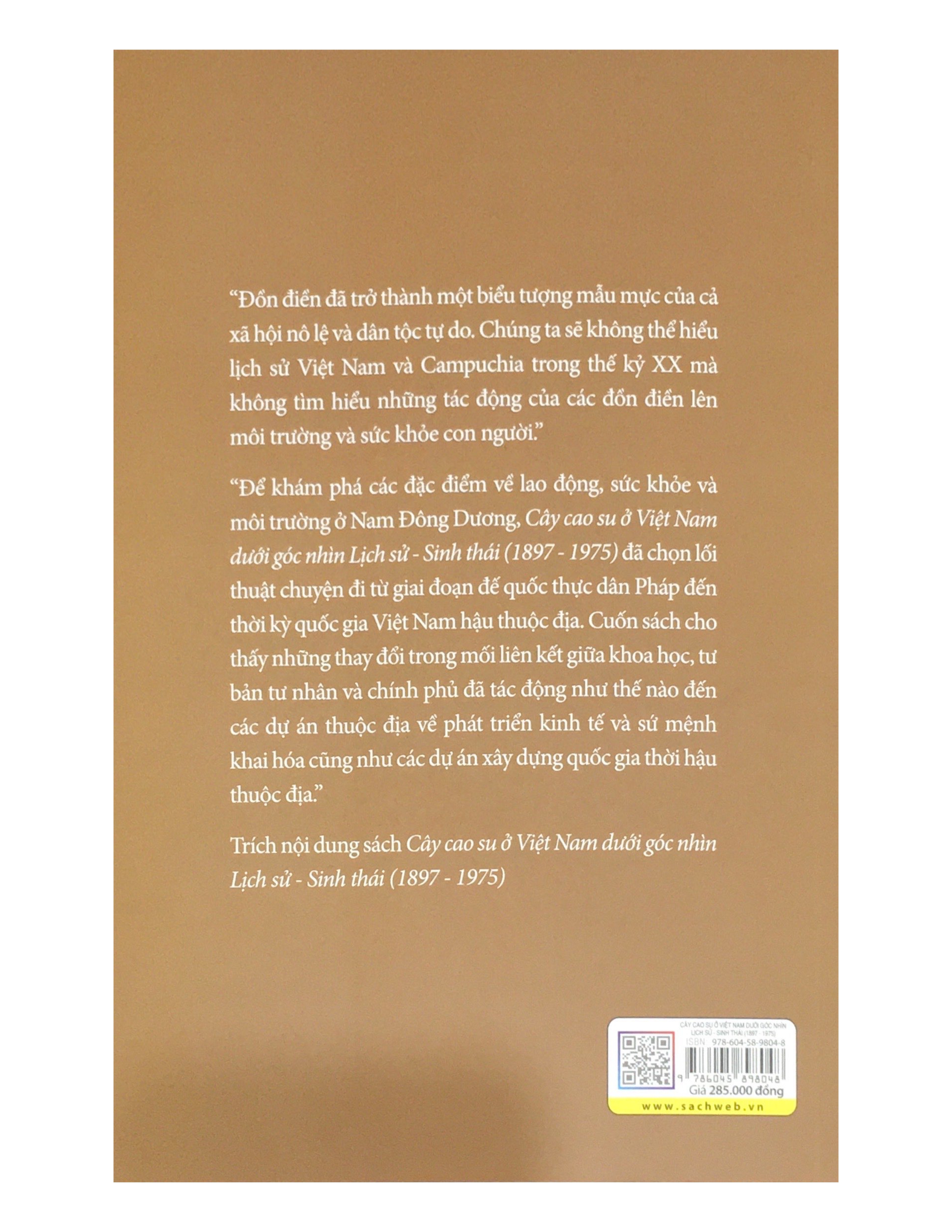 "Để khám phá các đặc điểm về lao động, sức khỏe và môi trường ở Nam Đông Dương, Cây cao su ở Việt Nam dưới góc nhìn Lịch sử - Sinh thái (1897 - 1975) đã chọn lối thuật chuyện đi từ giai đoạn đế quốc thực dân Pháp đến thời kỳ quốc gia Việt Nam hậu thuộc địa. Cuốn sách cho thấy những thay đổi trong mối liên kết giữa khoa học, tư bản tư nhân và chính phủ đã tác động như thế nào đến các dự án thuộc địa về phát triển kinh tế và sứ mệnh khai hóa cũng như các dự án xây dựng quốc gia thời hậu thuộc địa"