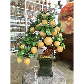 Chất liệu: Quả đào bằng đá thạch anh hồng, lá và chậu cây là đá ngọc Ấn Độ Bao gồm: 28 quả Kích thước: Cao 50 cm x Ngang 34 cm Khối lượng: 6 kg
