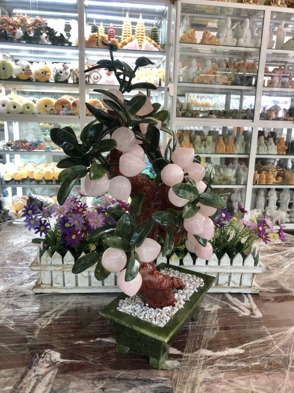 Chất liệu: Quả đào bằng đá thạch anh hồng, lá và chậu cây là đá ngọc Ấn Độ Bao gồm: 28 quả Kích thước: Cao 50 cm x Ngang 34 cm Khối lượng: 6 kg