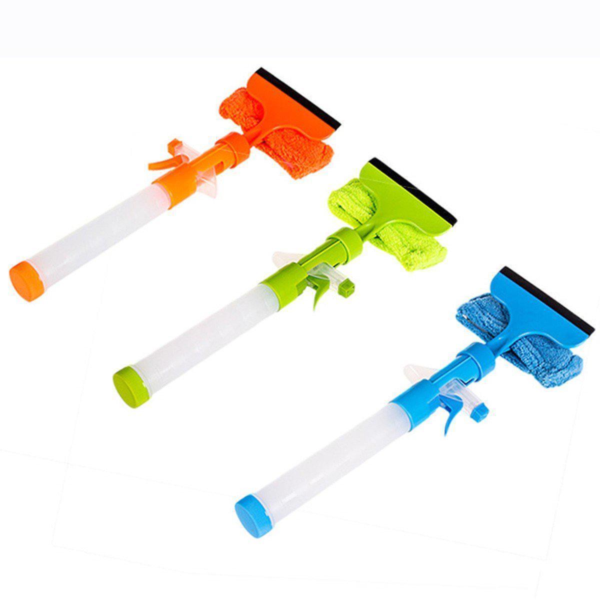 Cây lau kính thông minh 2 mặt gạt nước và lau chùi, có đầu xịt dung dịch tẩy rửa.