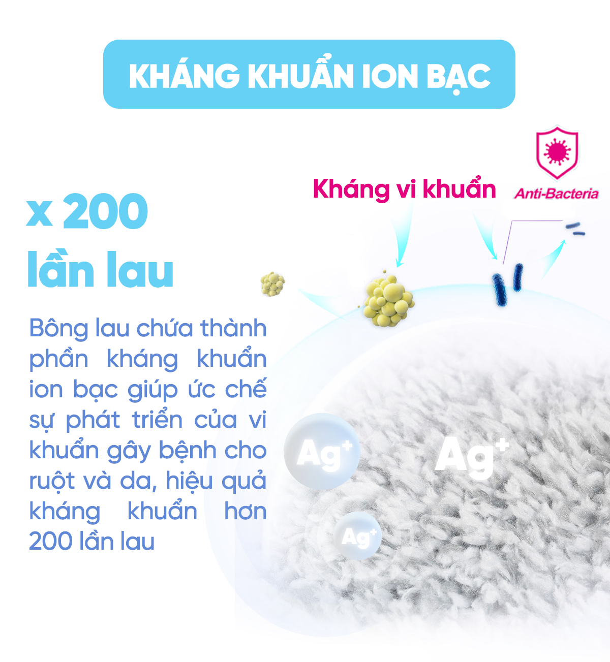 • Khăn lau có chứa thành phần kháng khuẩn ion bạc, có khả năng ức chế sự phát triển của Escherichia coli và Staphylococcus aureus một cách hiệu quả, đồng thời vẫn có tác dụng kháng khuẩn sau 200 lần lau.