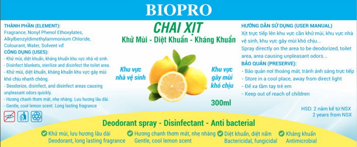 Chai xịt Biopro khử mùi diệt khuẩn kháng khuẩn Khu vực gây mùi khó chịu Khu vực nhà vệ sinh Hương chanh thơm mát dịu nhẹ => Shop xin cam kết Hạn sử dụng của sản phẩm vẫn còn xa (Sản phẩm chất lượng, Hàng luôn mới sản xuất)