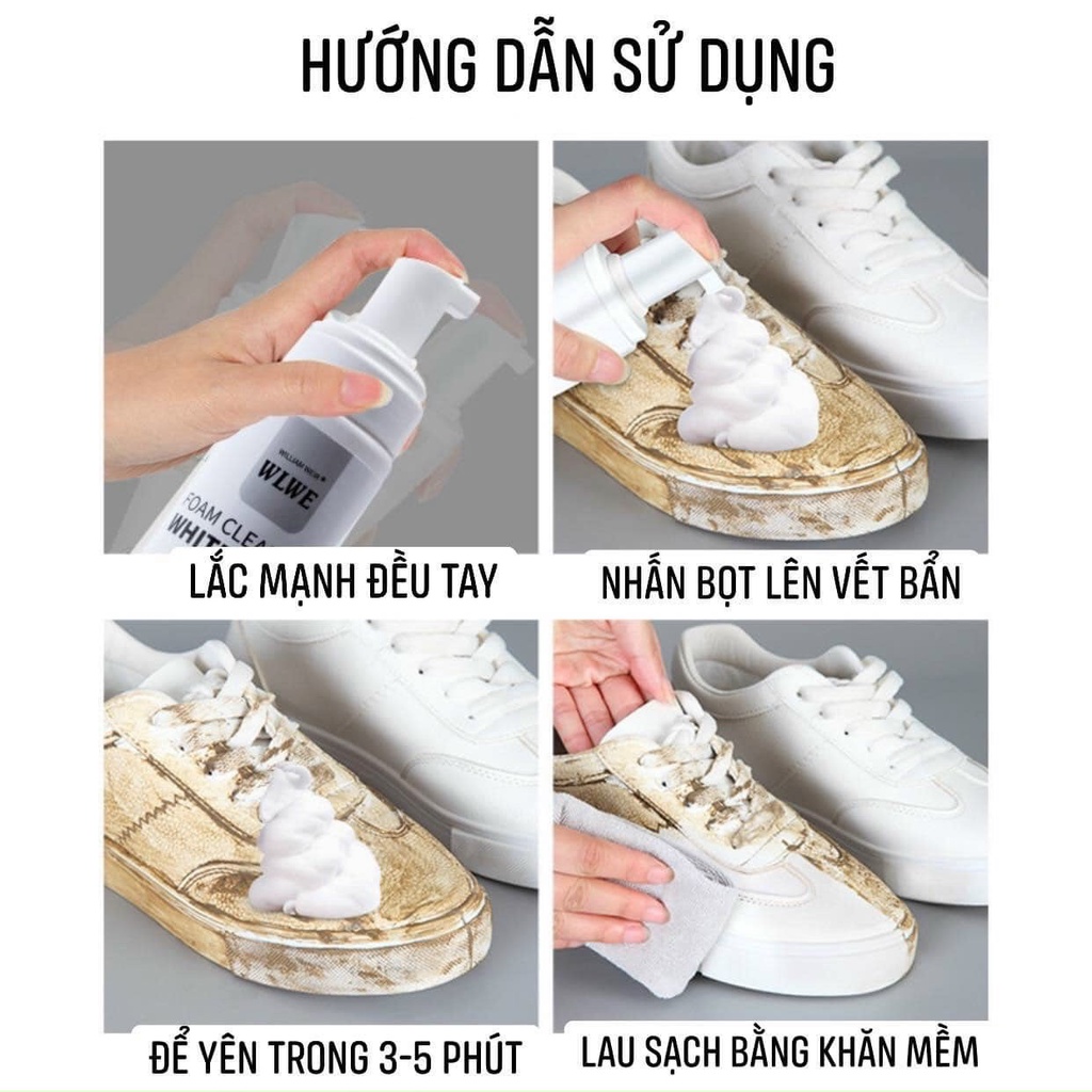 - Bước 4: Cuối cùng thì dùng khăn mềm để loại bỏ bọt, lâu khô các bụi bẩn. Lưu ý: Đối với vết bẩn cứng đầu, bạn lặp lại bước 1-4 (Từ 1 đến 3 lần). các vết tẩy ố nhẹ có thể clean sạch, còn đối với các vết sơn hay ố lâu ngày cần phải dùng sản phẩm Tẩy ố chuyên để làm sạch. Chai xịt bọt tuyết vệ sinh giày Sneaker đa năng Thể tích: 200ml Tạo bọt nhẹ, mềm mại và tinh tế Thiết kế vòi phun khí nén, rất dễ sử dụng Tính năng của sản phẩm: khả năng thẩm thấu mạnh, hiệu quả làm sạch nhanh chóng bụi bẩn, nấm mốc, vết ố vàng. Làm sạch các vết bẩn, vết ố nhanh chóng, giúp đôi giày của bạn sáng bóng, trắng sạch như mới Nút nhấn ở đầu tiện lợi, dễ sử dụng Được làm từ công thức an toàn, không gây độc hại, không cần dùng găng tay Chỉ cần lau bằng khăn, không cần rửa lại với nước, giúp bạn tiết kiệm thời gian. Chân thành cảm ơn quý khách!