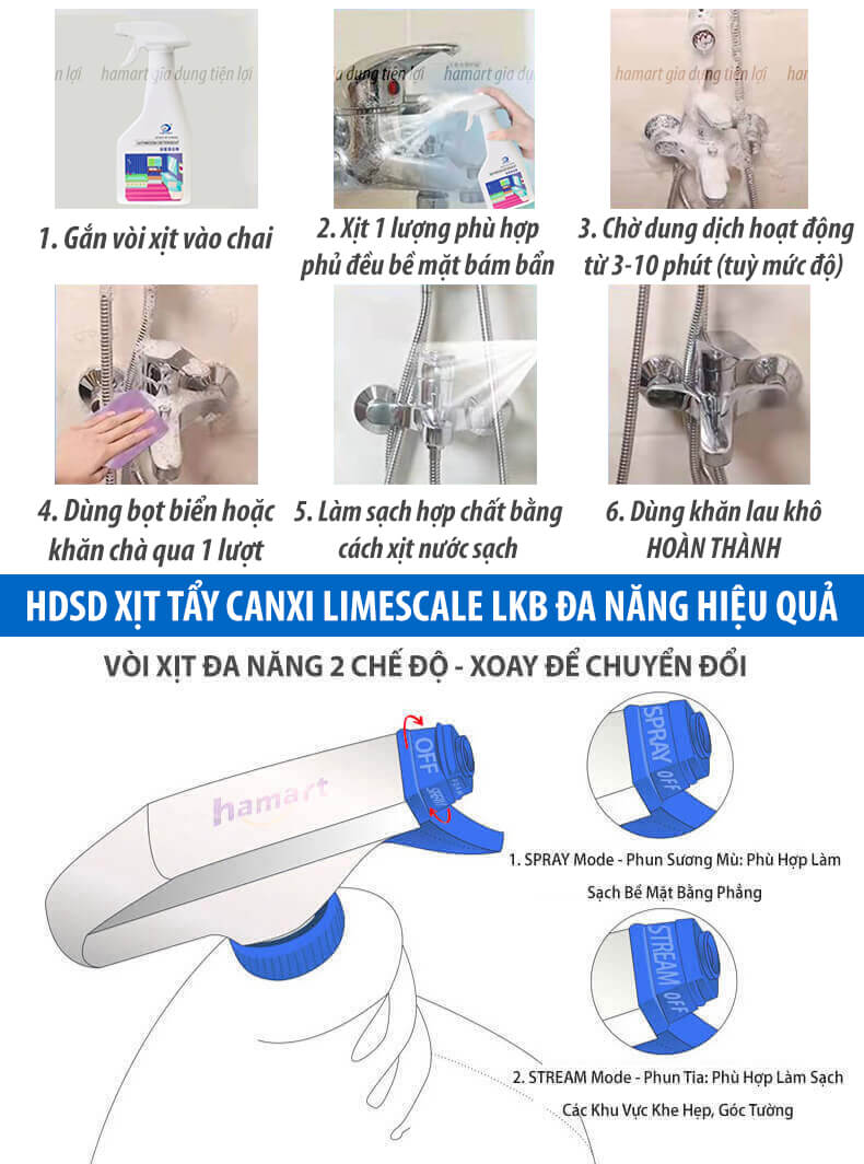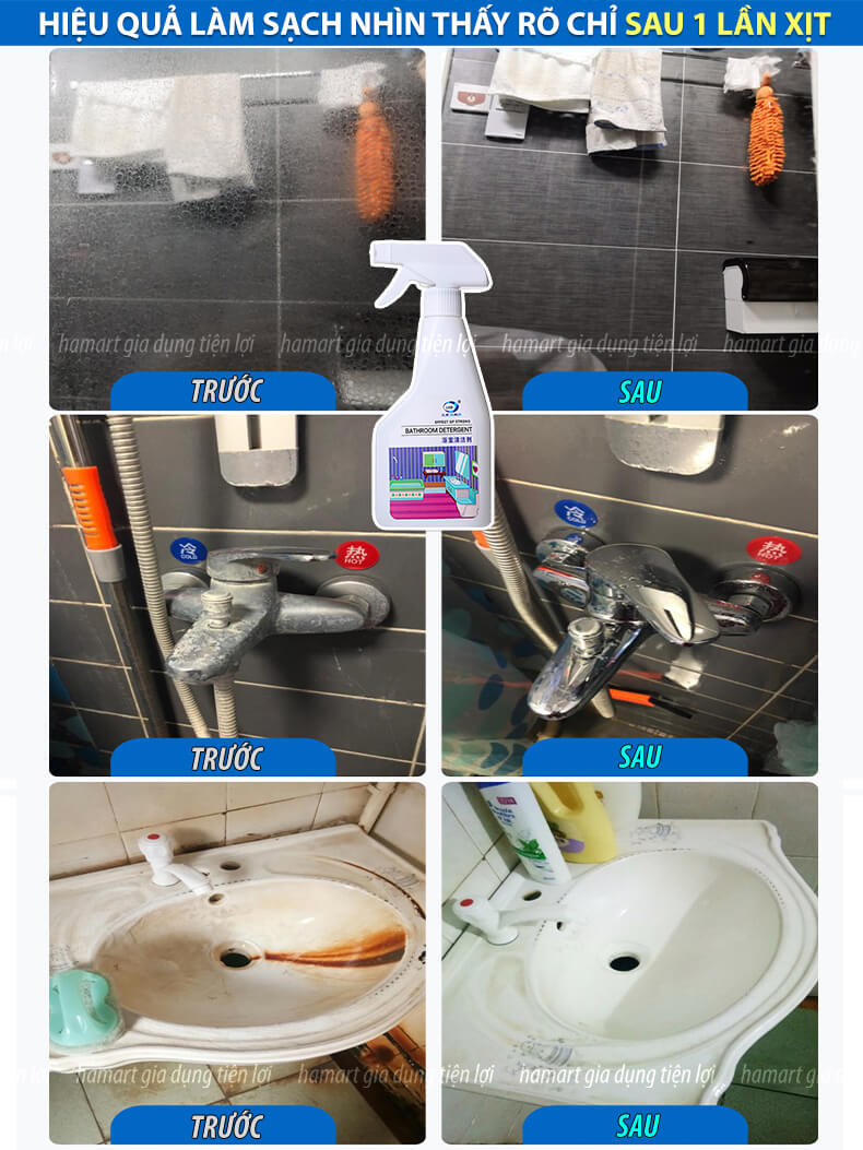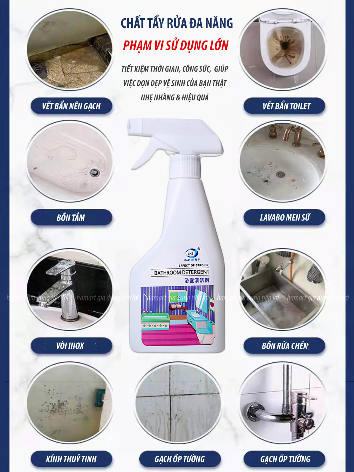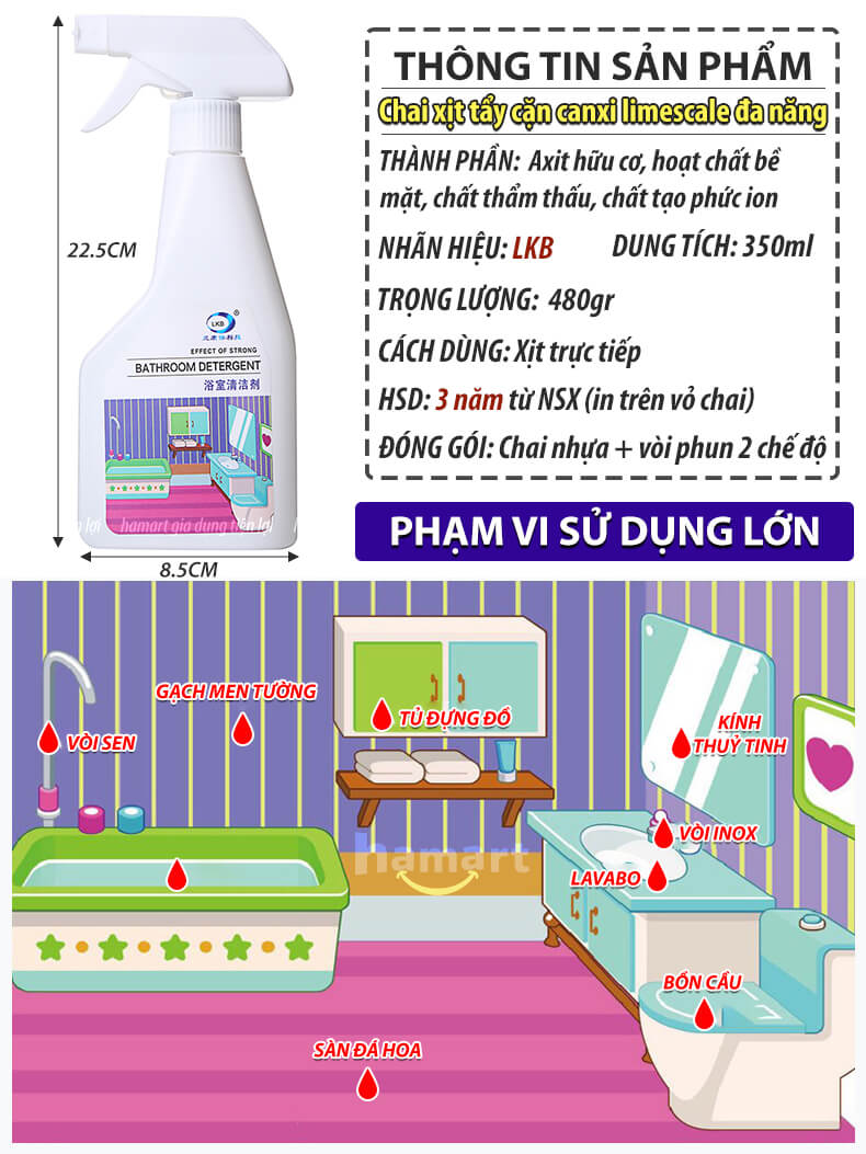 - Chuyên dụng để tẩy cặn canxi của mọi thiết bị trong nhà tắm từ vòi rửa inox, kính thuỷ tinh, bồn rửa mặt sứ, gạch men ốp tường, đá hoa lát sàn, bồn cầu, bồn tắm ...
