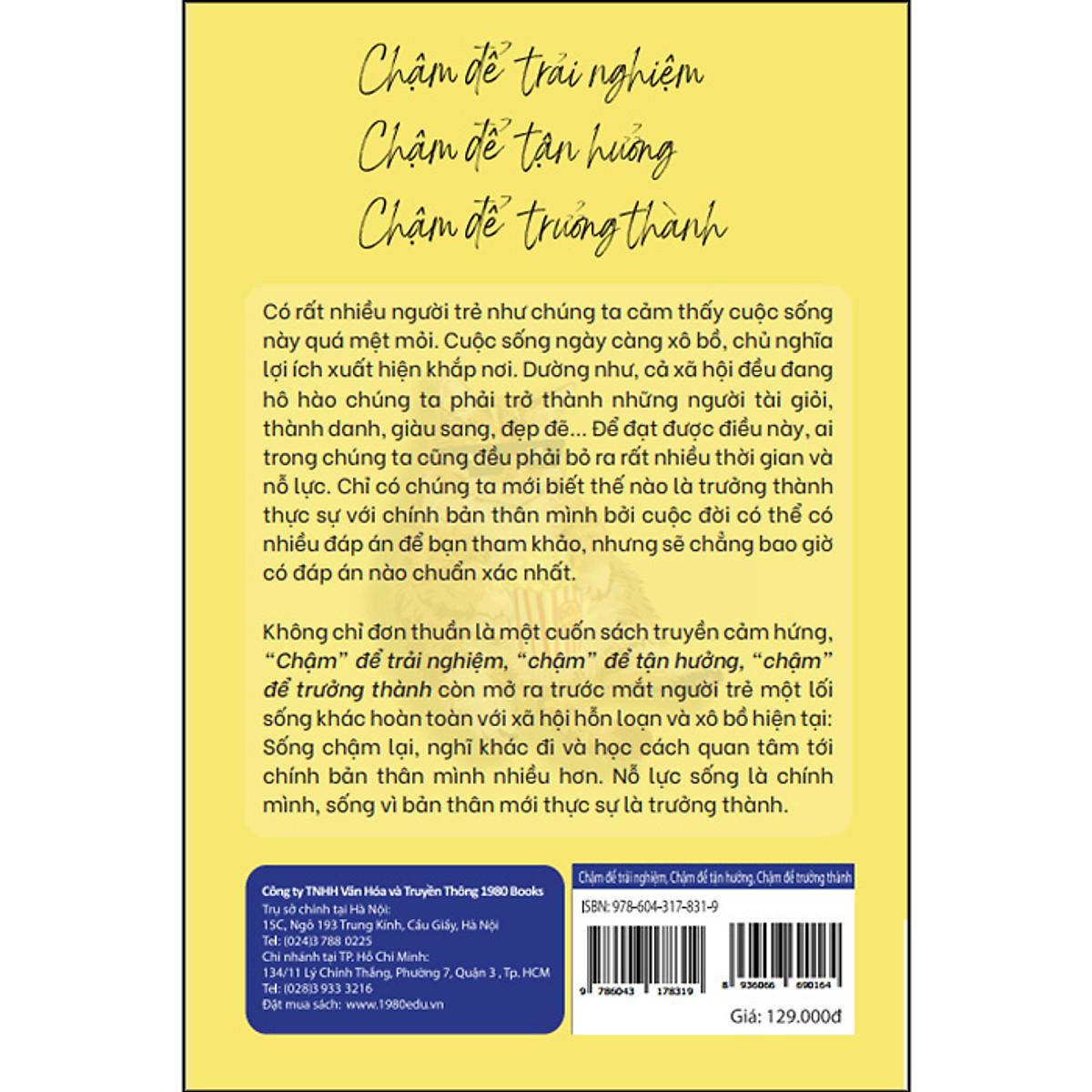 Những lo lắng hay hy vọng về cuộc đời có lẽ ẩn hiện trong những nhân viên công sở tan làm, ngồi ở một con hẻm nhỏ ăn một bát cháo thịt băm; cũng có thể là tấm hình thần tượng được treo trên tường trong những phòng kí túc xá cũ; hay cũng có thể là một ngày lạc trong rừng sâu ngồi trò chuyện với vị hòa thượng già. Cũng giống như khi chơi bàn cát, bạn có đáp án tham khảo, nhưng không có đáp án chính xác. Lựa chọn thế nào sẽ quyết định bạn có những trải nghiệm ra sao. Trên thực tế, bạn không cần phải cố chen chân vào những nơi xô bồ, bon chen; càng không cần vội vã làm việc ở những ngành nghề áp lực nhất khi vừa mới tốt nghiệp; cũng không cần vội vàng xem mắt, kết hôn khi mới vừa hai mươi xuân xanh. Chỉ có bạn, người sống giữa cuộc đời và các mối quan hệ xã hội chân thực, mới có thể hiểu được liệu những điều này có đáng hay không, có cần thiết hay không.” Sau tuổi đôi mươi, bạn chính là người trưởng thành của chính mình. Thử nghiệm nhiều, trải nghiệm nhiều, trả giá nhiều mới là chìa khóa duy nhất mở ra ‘thời kỳ trưởng thành’ của bạn. Cho dù chặng đường độc hành gian khổ, bạn cảm thấy tủi thân những lúc đau ốm không có người ở bên, cảm thấy thật đen đủi khi gặp phải những kẻ chẳng ra gì, thì dù sao đó cũng là những trải nghiệm có một trong hai trong đời. Không chỉ đơn thuần là một cuốn sách truyền cảm hứng, “Chậm” để trải nghiệm, “chậm” để tận hưởng, “chậm” để trưởng thành còn mở ra trước mắt người trẻ một lối sống khác hoàn toàn với xã hội hỗn loạn và xô bồ hiện tại: Sống chậm lại, nghĩ khác đi và học cách quan tâm tới chính bản thân mình nhiều hơn. Nỗ lực sống là chính mình, sống vì bản thân mới thực sự là trưởng thành. Một vài trích dẫn hay: “Nghĩ nhiều làm ít, tâm tư phức tạp sẽ khiến cuộc sống càng trở nên mệt mỏi. Giảm áp lực cho bản thân cũng là một loại năng lực.” “Không có nguyên tắc nào cho cuộc sống, lựa chọn càng không có đúng sai, giá trị của bản thân cũng không ngừng được bồi đắp. Những bước đi trong cuộc đời được quyết định hoàn toàn không chỉ phụ thuộc vào lựa chọn mà còn phụ thuộc vào tâm thế sau sự lựa chọn ấy.” “Bạn không cần phải cố chen chân vào những nơi xô bồ, bon chen; càng không cần vội vã làm việc ở những ngành nghề áp lực nhất khi vừa mới tốt nghiệp; cũng không cần vội vàng xem mắt, kết hôn khi mới vừa hai mươi xuân xanh. Chỉ có bạn, người sống giữa cuộc đời và các mối quan hệ xã hội chân thực, mới có thể hiểu được những điều này có đáng hay không, có cần thiết hay không.” “Khi tài năng của bạn không tương xứng với thu nhập, mong bạn đừng bỏ dở giữa chừng; khi bạn bị ép đến nơi mình không thích, hãy giải quyết vấn đề một cách nhanh chóng, dứt khoát, kịp thời; khi bạn không nhìn rõ con đường mịt mù phía trước, hãy lạc quan, sống cho thực tại.” “Có nhiều người vừa không để ý điều kiện của bản thân, vừa không lựa chọn những con đường để bước tiếp. Họ chỉ dựa vào một niềm tin nồng cháy rằng ‘ngày mai sẽ tốt hơn’ để rồi hoang phí những tháng ngày trước mắt.”