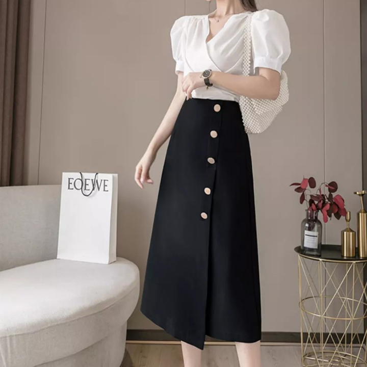 Chân Váy Công Sở Dáng Váy Chữ A Dài Qua Gối Hàng Thiết Kế Kiểu Tà Đấp Che Bụng Phối Cúc cá Tính