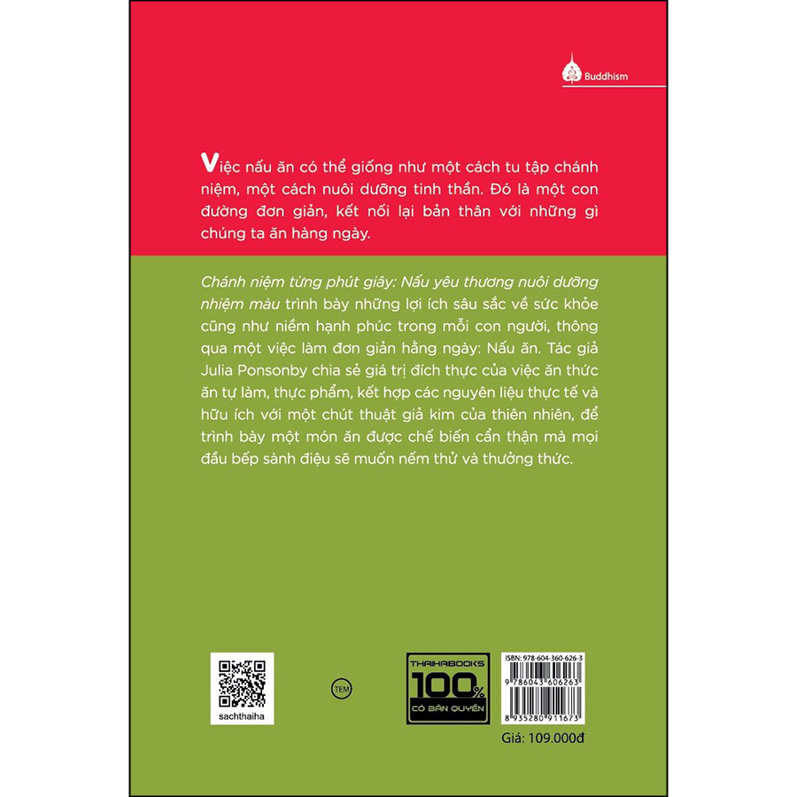 Đây là cuốn sách nằm trong bộ “Chánh niệm từng phút giây”. Cuốn sách gợi mở những suy nghĩ mới về nấu ăn - một trong những hoạt động thú vị nhất mà chúng ta thực hiện mỗi ngày – như một cách tiếp cận có “chánh niệm” hơn với cuộc sống.