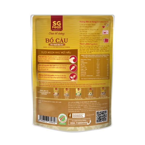Cháo bổ dưỡng với thành phần từ Bồ Câu Ra Ràng & Yến Mạch - Hạt sen và các Viatamin nhóm B (B1, B6, B9), cung cấp dưỡng chất cần thiết cho cơ thể.