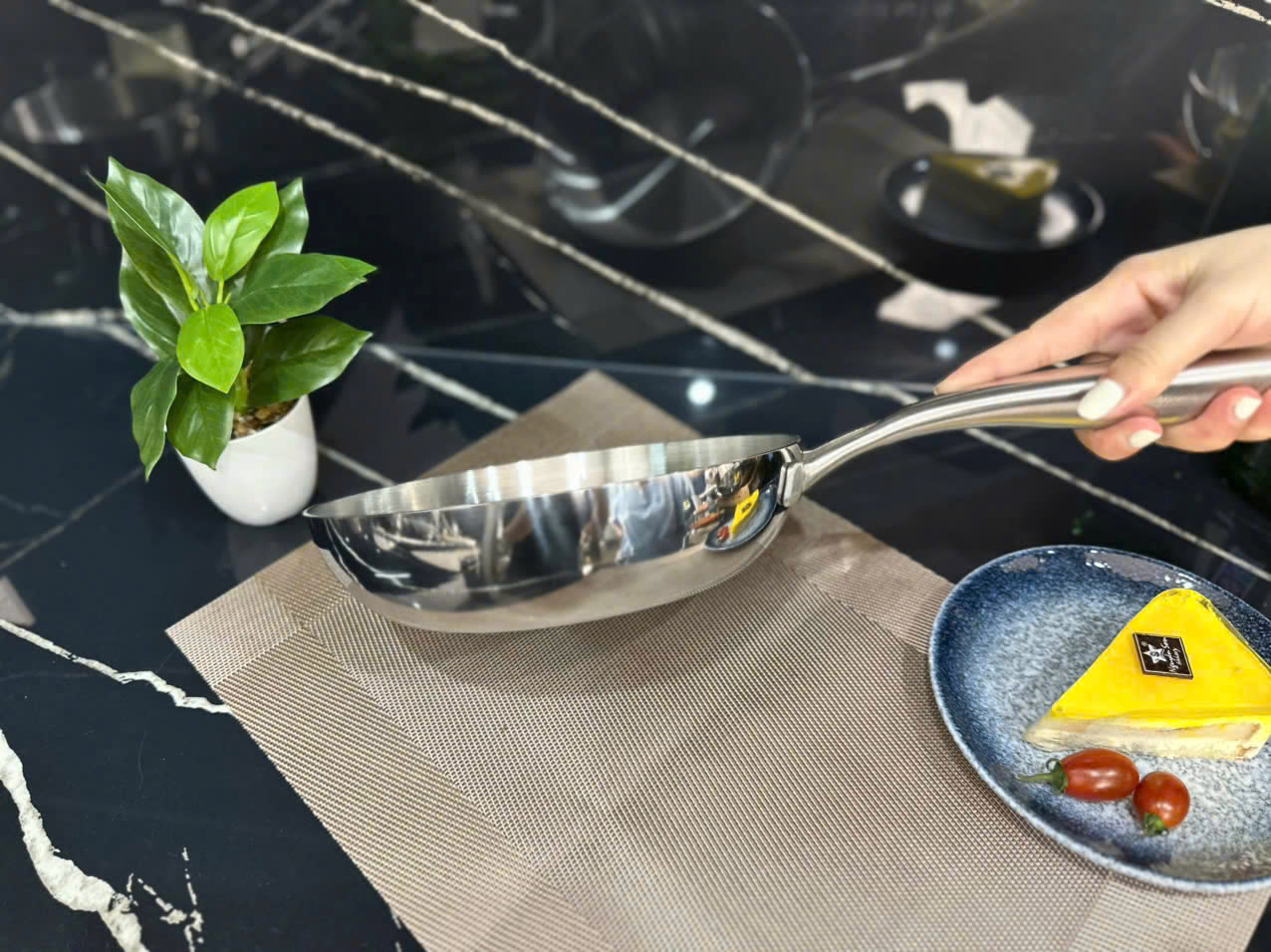 Không sử dụng lớp chống dính, đáy liền nguyên khối dầy dặn, dễ dàng vệ sinh. Không kén bếp, nhiệt lớn, cán chảo inox không bị nóng khi dùng với bếp từ.