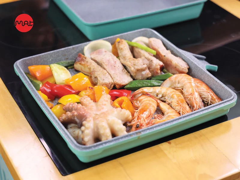 Thiết kế chuyên dụng phù hợp cho các món nướng, dùng trực tiếp với bếp Từ, bếp điện, bếp gas, bếp hồng ngoại.Lòng Chảo có các đường gân nổi song song giúp thực phẩm không