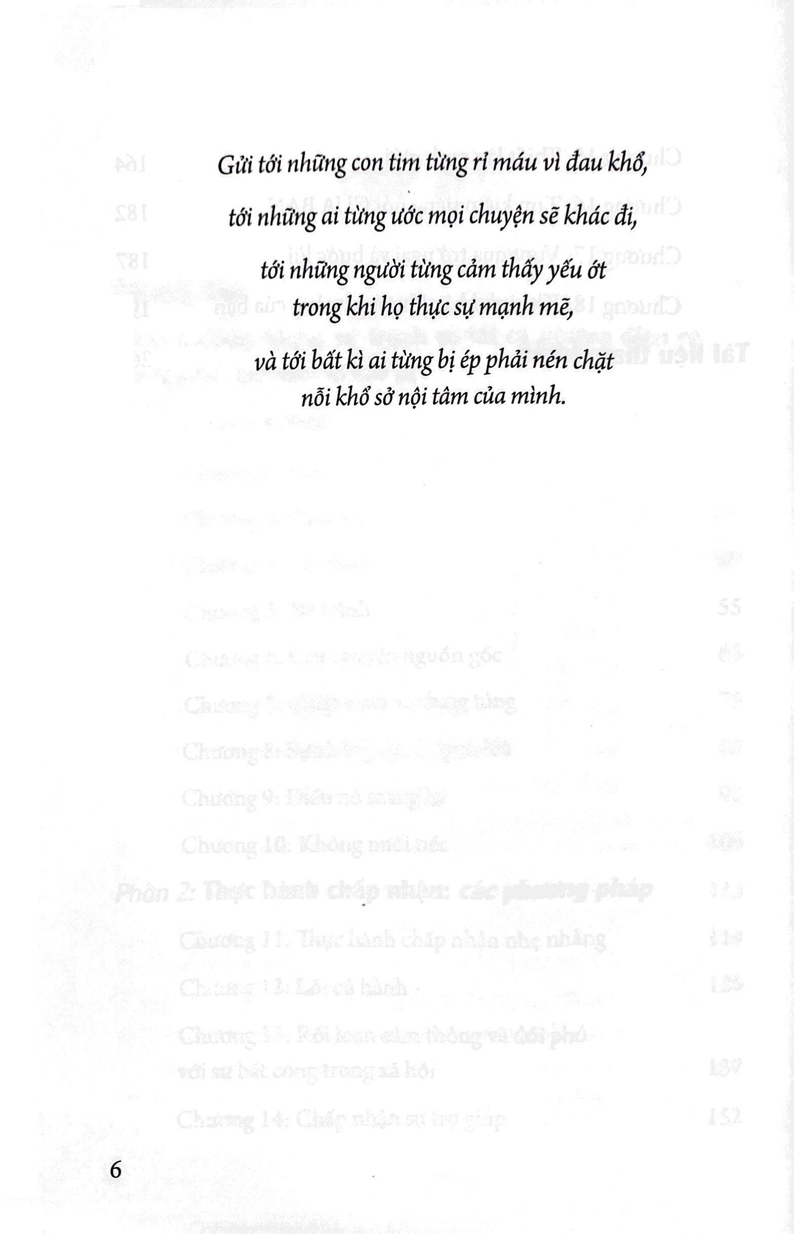 Cuốn sách được chia làm hai phần. Phần một sẽ đưa bạn đọc xem xét và tìm hiểu thế nào là chấp nhận, tại sao sự chấp nhận là quan trọng và cung cấp cho độc giả những ví dụ lâm sàng của những cá nhân khác - những người đang phải vật lộn với sự chấp nhận và hành trình sau đó của họ. Phần thứ hai của cuốn sách sẽ tập trung vào cách thực hành chấp nhận qua các bài thực hành cụ thể, cũng như cách để đối phó với những thử thách có thể xảy ra trên hành trình của bạn.