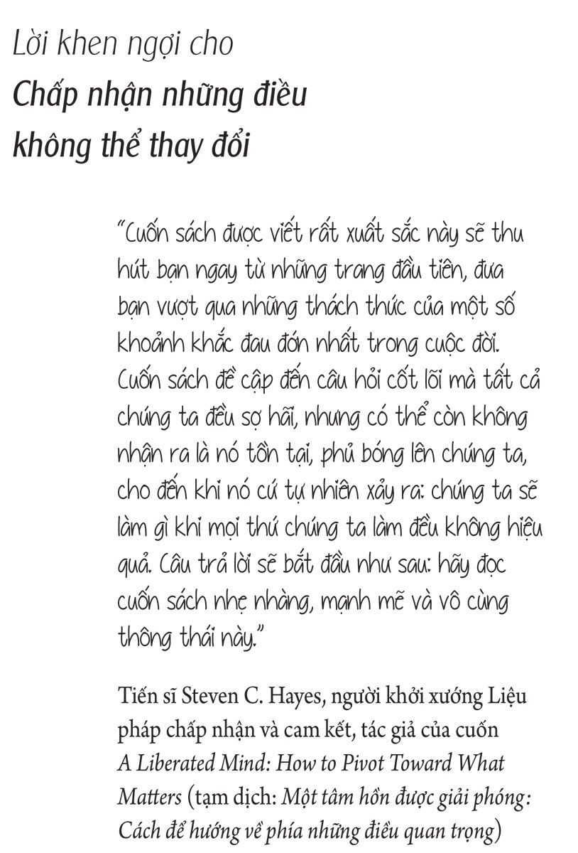 "Cuốn sách được viết rất xuất sắc này sẽ thu hút bạn ngay từ những trang đầu tiên, đưa bạn vượt qua những thách thức của một số khoảnh khắc đau đớn nhất trong cuộc đời. Cuốn sách đề cập đến câu hỏi cốt lõi mà tất cả chúng ta đều sợ hãi, nhưng có thể còn không nhận ra nó tồn tại, phủ bóng lên chúng ta, cho đến khi nó cứ tự nhiên xảy ra: chúng ta sẽ làm gì khi mọi thứ chúng ta làm đều không hiệu quả. Câu trả lời sẽ bắt đầu như sau: hãy đọc cuốn sách nhẹ nhàng, mạnh mẽ và vô cùng thông thái này." - Tiến sĩ C.Hayes, người khởi xướng Liệu pháp chấp nhận và cam kết, tác giả của cuốn A Liberated Mind: How To Pivot Toward What Matters (tạm dịch: Một tâm hồn được giải phóng: Cách để hướng về phía những điều quan trọng) và Thoát Khỏi Tâm Trí Và Cuộc Sống (Minh Long Book đã phát hành) .