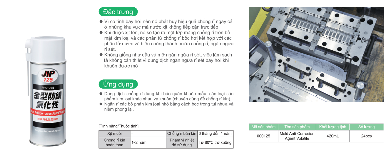 Mua tại TiktokChất chống chống gỉ JIP 125 là một sản phẩm của tập đoàn Ichinen Chemicals (Taiho Kohzai). Sản phẩm khác biệt với các chất chống gỉ khác nhờ tính bay hơi nhanh; nên không cần phải sử dụng chất tẩy rửa trước khi sử dụng lại khuôn. Công dụng chất chống gỉ cho khuôn JIP 125