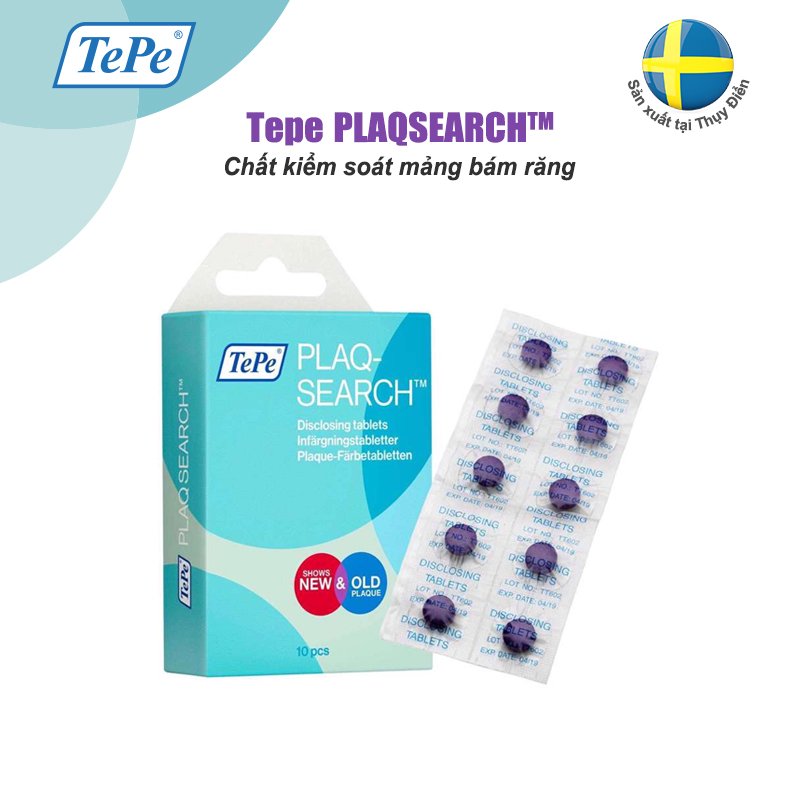 - Chất kiểm soát mảng bám răng Tepe PlaqSearch là sản phẩm tạo ra hai tông màu để biểu thị các mảng bám trên răng, màu đỏ cho các mảng bám mới và màu xanh cho các mảng bám cũ.