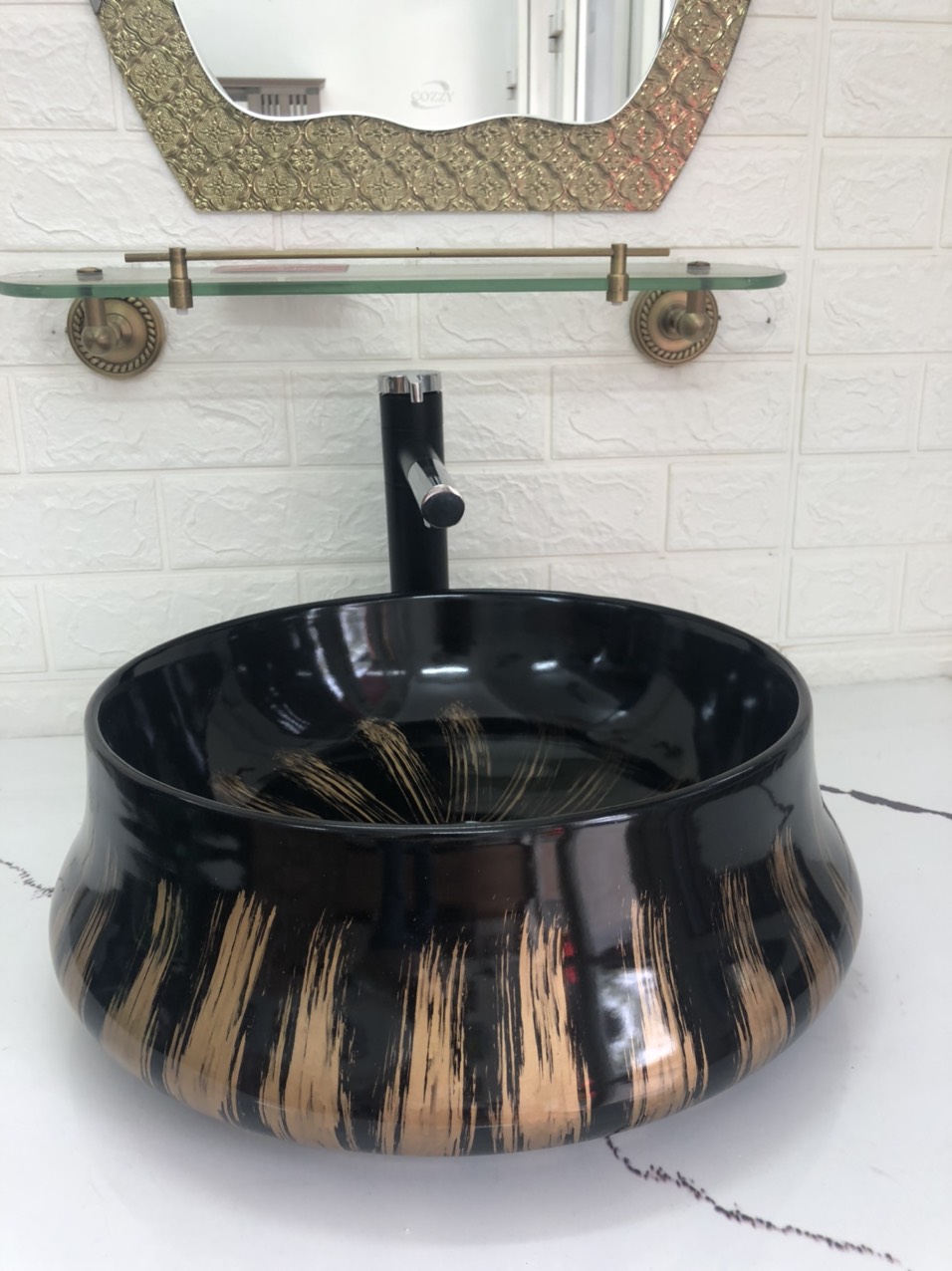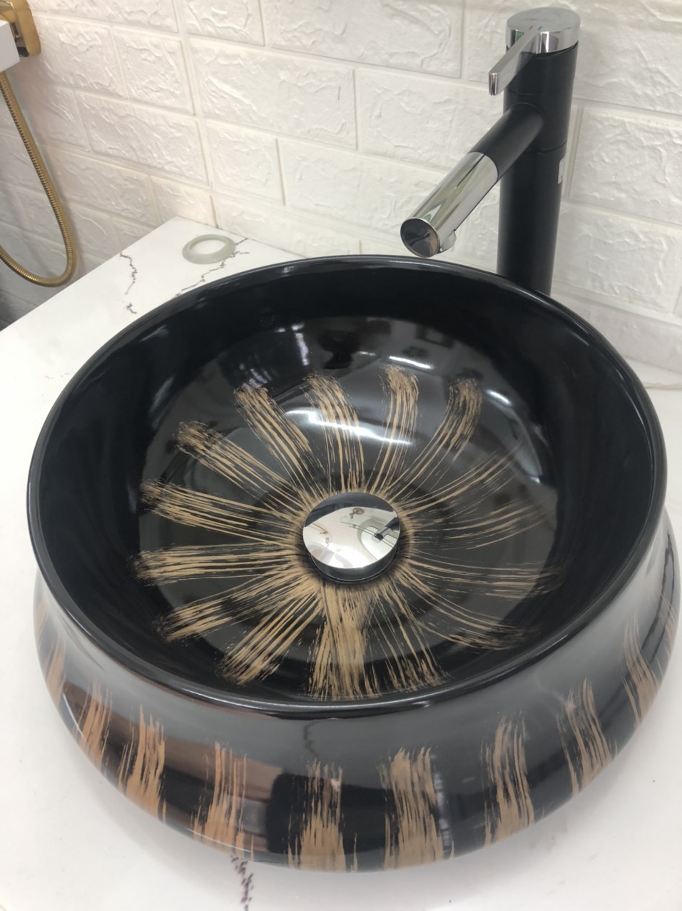 Chậu Tròn Đen Ánh Vàng GRVL04 ️ Thiết kế tinh tế, màu ĐEN bóng mặt trong và ngoài, ,Màu đen quét ánh vàng làm cho không gian phòng tắm trở lên hiện đại và huyền bí, phù