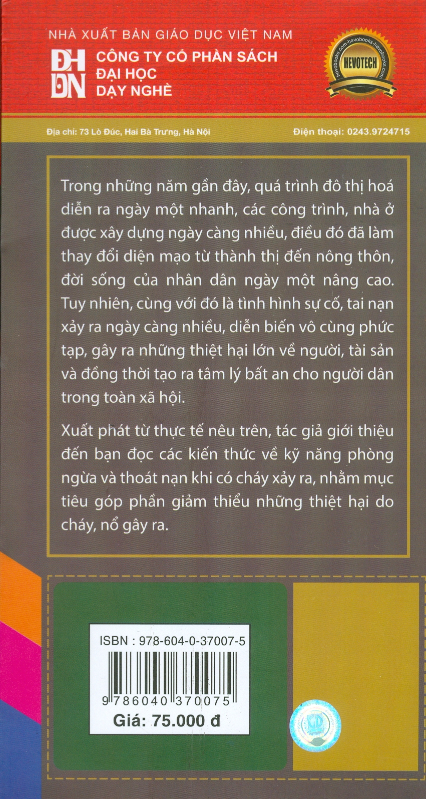 Xuất phát từ thực tế nêu trên, tác giả biên soạn cuốn sách giới thiệu đến bạn đọc các kiến thức về kỹ năng phòng ngừa và thoát nạn khi có cháy xảy ra, nhằm mục tiêu góp phần giảm thiểu những thiệt hại do cháy, nổ gây ra.