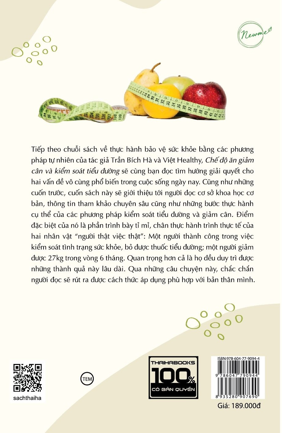 Tiếp theo chuỗi sách về thực hành bảo vệ sức khỏe bằng các phương pháp tự nhiên của tác giả Trần Bích Hà và Việt Healthy, “Chế độ ăn giảm cân và kiểm soát tiểu đường” sẽ cùng bạn đọc tìm hướng giải quyết cho hai vấn đề vô cùng phổ biến trong cuộc sống ngày nay. Cũng như những cuốn trước, cuốn sách này sẽ giới thiệu tới người đọc cơ sở khoa học cơ bản, thông tin tham khảo chuyên sâu cũng như những bước thực hành cụ thể của các phương pháp kiểm soát tiểu đường và giảm cân. Điểm đặc biệt của nó là phần trình bày tỉ mỉ, chân thực hành trình thực tế của hai nhân vật “người thật việc thật”: Một người thành công trong việc kiểm soát tình trạng sức khỏe, bỏ được thuốc tiểu đường; một người giảm được hơn 30kg. Quan trọng hơn cả là họ đều duy trì được những thành quả này lâu dài. Qua những câu chuyện này, chắc chắn người đọc sẽ rút ra được cách thức áp dụng phù hợp với bản thân mình.
