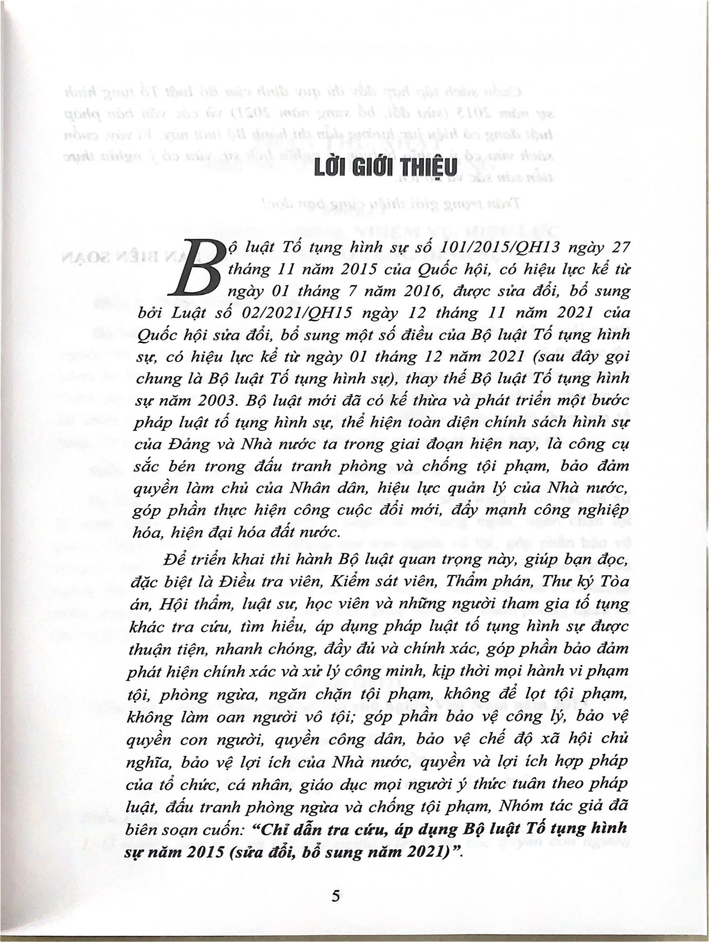 Để triển khai thi hành Bộ luật quan trọng này, giúp bạn đọc, đặc biệt là Điều tra viên, Kiểm sát viên, Thẩm phán, Thư ký Tòa án, Hội thẩm, luật sư, học viên và những người tham gia tố tụng khác tra cứu, tìm hiểu, áp dụng pháp luật tố tụng hình sự được thuận tiện, nhanh chóng, đầy đủ và chính xác, góp phần bảo đảm phát hiện chính xác và xử lý công minh, kịp thời mọi hành vi phạm tội, phòng ngừa, ngăn chặn tội phạm, không để lọt tội phạm, không làm oan người vô tội; góp phần bảo vệ công lý, bảo vệ quyền con người, quyền công dân, bảo vệ chế độ xã hội chủ nghĩa, bảo vệ lợi ích của Nhà nước, quyền và lợi ích hợp pháp của tổ chức, cá nhân, giáo dục mọi người ý thức tuân theo pháp luật, đấu tranh phòng ngừa và chống tội phạm, Nhóm tác giả đã biên soạn cuốn: “Chỉ dẫn tra cứu, áp dụng Bộ luật Tố tụng hình sự năm 2015 (sửa đổi, bổ sung năm 2021)”.
