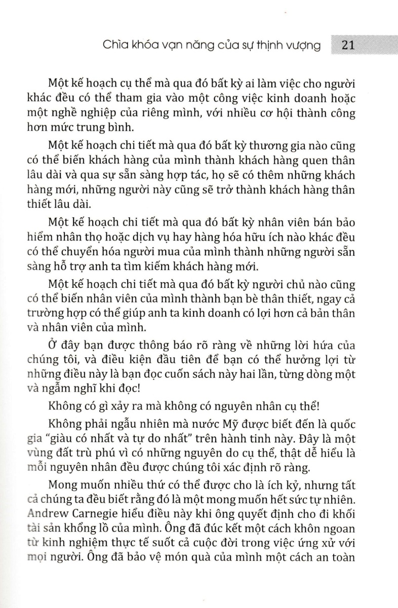 Dựa trên bí quyết thành công của tỷ phú Andrew Carnegie, cuốn sách Chìa khóa vạn năng mô tả chi tiết triết lý vĩ đại nhất về thành công, một cách thực tế nhất. Triết lý này sẽ chỉ cho bạn đọc cách để đạt được thành công trên bất kì con đường nào của cuộc sống, dù là tình yêu, sự giàu có về vật chất, tinh thần hay bất cứ mục tiêu nào khác.