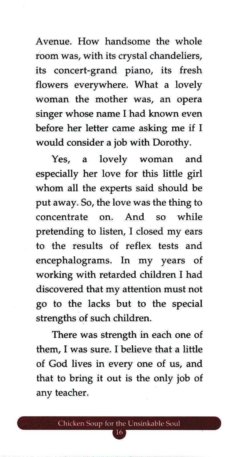 Tiếp đến, Chicken Soup for the Unsinkable Soul cũng sẽ giúp bạn nhận ra giá trị đích thực của những tấm lòng biết sẻ chia. Chúng tôi hy vọng những mẩu chuyện nhỏ ấy sẽ khuyến khích bạn tìm đến mọi người khi bạn cần được giúp đỡ cũng như giúp bạn sẽ mở rộng trái tim m.ình với những ai đang cần tựa đầu vào bờ vai bạn. Và cuối cùng, có rất nhiều mẩu chuyện sẽ chứng minh cho chúng ta thấy rằng trở ngại cũng chính là người thầy tốt nhất của mỗi người. Chúng có thể khơi dậy sức mạnh tiềm tàng của ta, nhắc chúng ta nhớ về những khía cạnh cần hoàn thiện, chỉ dẫn chúng ta cách giữ vững lòng tin vào chính m.ình và hướng dẫn ta cách chấp nhận những việc không thuộc phạm vi kiểm soát của bản thân.
