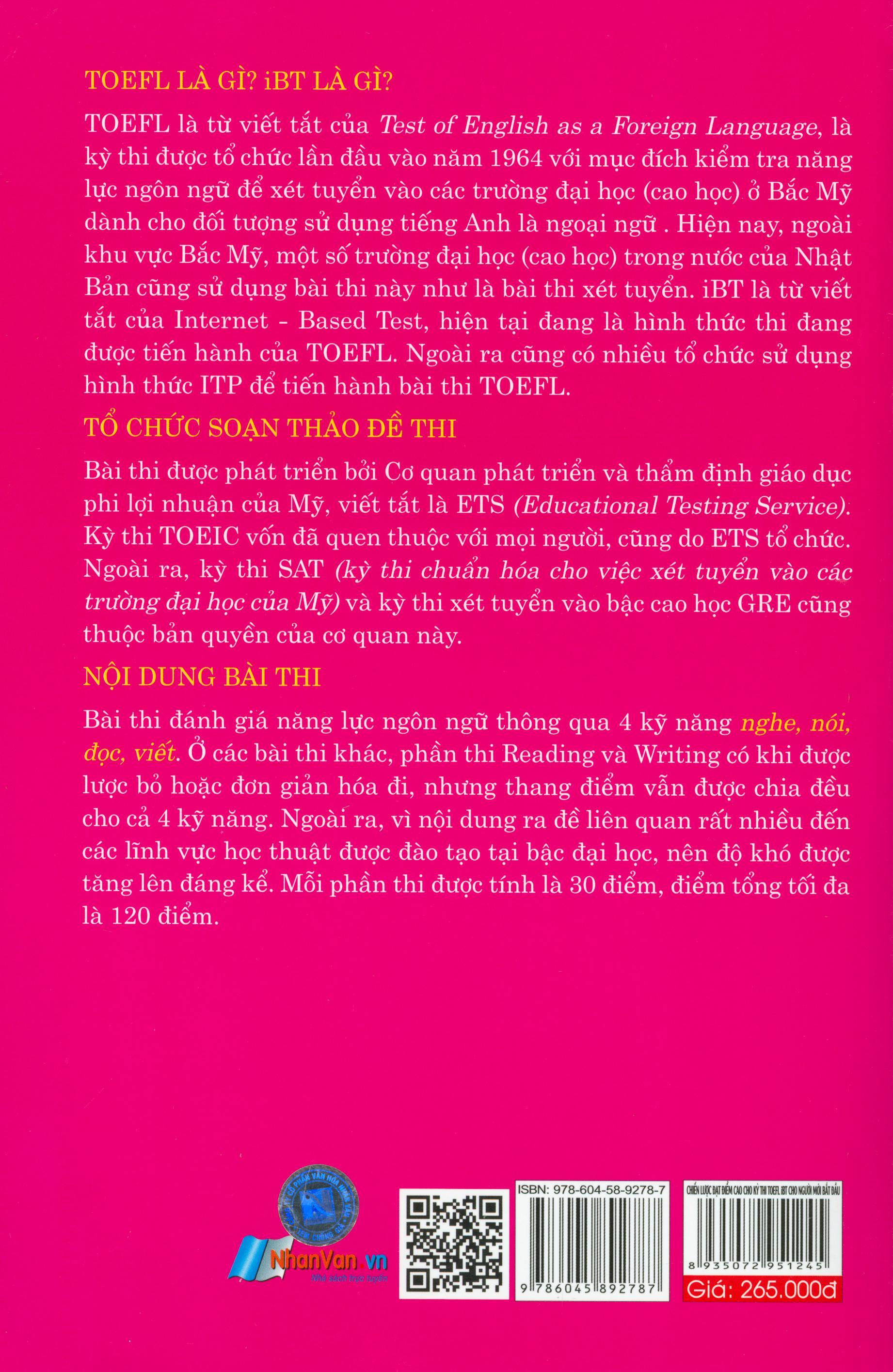 Công ty phát hành 1980 Books Năm xuất bản 2019 Kích thước 16 x 24 cm Bìa mềm Số trang 428 Tác giả: Bruce Stirling Speaking And Writing Strategies For The TOEFL- IBT là một
