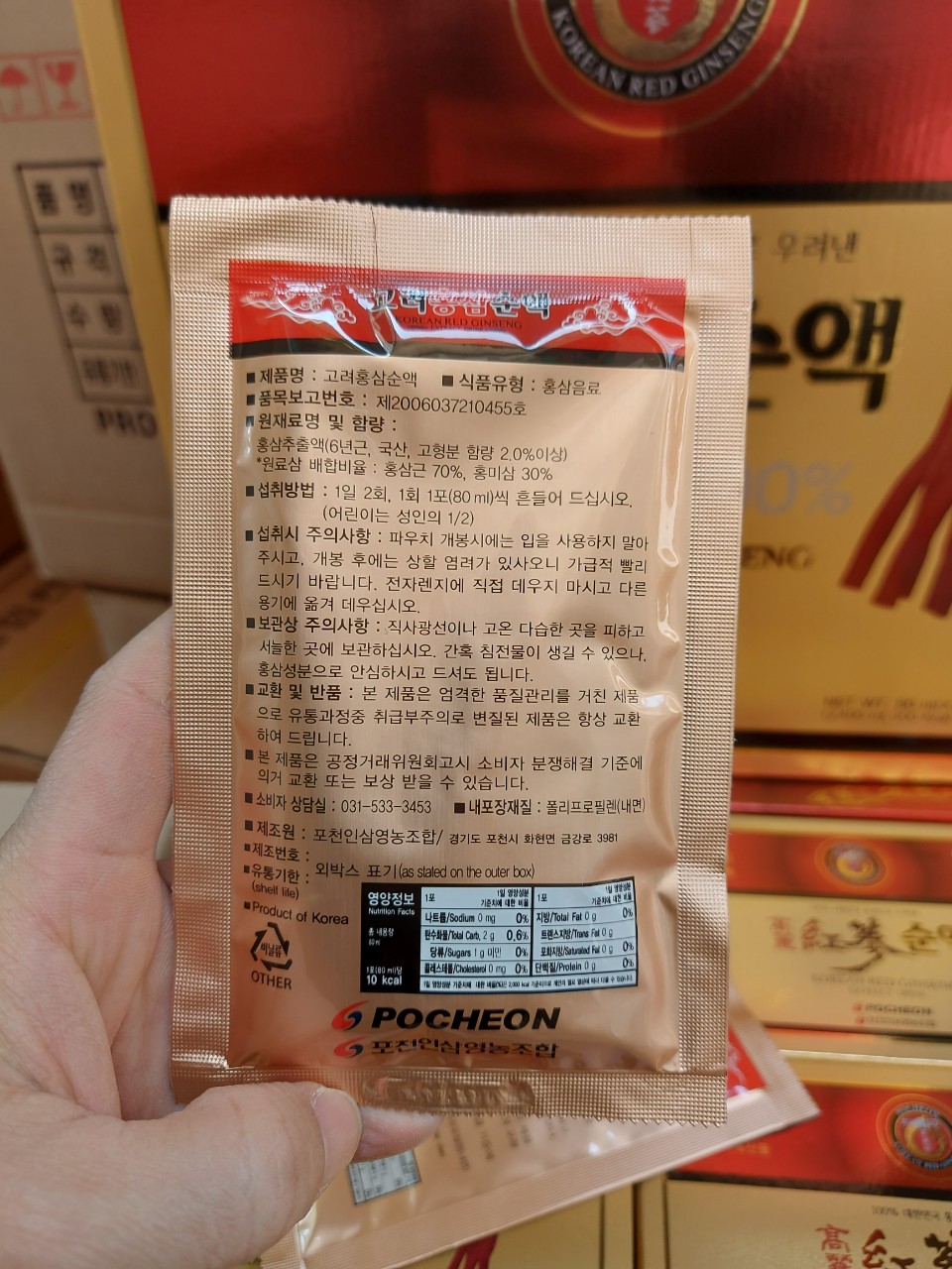 Xin trân trọng giới thiệu đến quý khách hàng dòng sản phẩm Nước Hồng Sâm thiên nhiên cao cấp được nhập khẩu chính hãng trực tiếp từ Hàn Quốc. Nước Hồng Sâm là sản phẩm được chiết xuất từ 100% tinh chất Hồng Sâm thiên nhiên Hàn Quốc.                                               Chỉ với 1 gói nhỏ 80ml cung cấp đầy đủ dưỡng chất cần thiết cho cơ thể của bạn và gia đình cho một ngày hoạt động, Thiết kế sản phẩm trang nhã, bắt mắt và sang trọng. Chiết xuất hồng sâm phù hợp để dùng làm quà tặng người thân, bạn bè và đồng nghiệp trong những dịp tết đến, xuân về. Thành phần dinh dưỡng của nước sâm Hàn Quốc  Được chiết xuất  từ 100% củ hồng sâm hàn quốc 6 năm tuổi với tỉ lệ phối trộn hồng sâm củ 70% và 30% rễ hồng sâm. Thành phần Rg1+Rg3> 5,5mg/gam trong sản phẩm Thời hạn sử dụng: 24 tháng kể từ ngày sản xuất. Ngày sản xuất in trên bao bì. Công dụng của nước sâm Hàn Quốc dạng gói 80ml: Giúp bồi bổ sức khỏe, tăng cường sức đề kháng, giúp cơ thể kháng lại các tác nhân độc hại từ môi trường xung quanh. Giảm mệt mỏi, căng thẳng do tác động của công việc và cuộc sống. Giúp chống lão hóa hiệu quả từ bên trong lẫn bên ngoài cơ thể. Ngăn ngừa và hỗ trợ điều trị đắc lực những bệnh lý nguy hiểm thường gặp, như tim mạch, tiểu đường, các bệnh lý về gan, đặc biệt hỗ trợ ngăn ngừa ung thư hiệu quả. Đối tượng sử dụng nước hồng sâm Hàn Quốc: Sản phẩm dùng được với mọi nhu cầu sức khỏe ở mọi lứa tuổi và giới tính người dùng. Thích hợp với người cao tuổi, người có thể trạng yếu, người đang trong quá trình dưỡng bệnh, người làm việc ở môi trường áp lực cao, người thường xuyên làm việc về đêm. Hướng dẫn sử dụng và bảo quản: Dùng trực tiếp 1-2 lần/ngày, người lớn 70ml/ lần, trẻ em uống bằng ½ liều người lớn. Vì sản phẩm được chiết xuất 100% từ Hồng Sâm thiên nhiên, không chứa chất bảo quản, nên nếu dùng không hết sản phẩm. Vui lòng bảo quản trong ngăn mát tủ lạnh. Bảo quản nơi khô ráo, thoáng mát, tránh ánh nắng trực tiếp Quy cách đóng gói: Một hộp gồm có 30 gói, mỗi gói 80ml Nguồn gốc xuất xứ: Pocheon Co., Ltd – Hàn Quốc Xuất xứ: Hàn Quốc lưu ý sản phẩm này không phải là thuốc không thay thế thuốc chữa bệnh