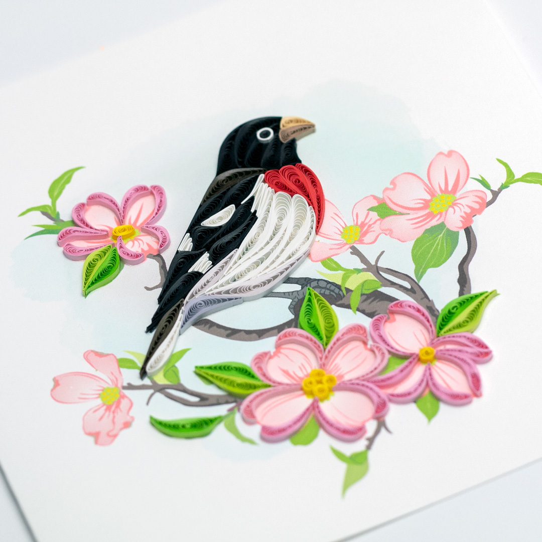 VỀ SẢN PHẨM BẠN ĐANG QUAN TÂM Mẫu thiết kế: Chim tước mỏ lớn ngực đỏ và hoa thù du hồng - Thiệp giấy xoắn 15 x 15 cm Chủ đề: Các loài động vật