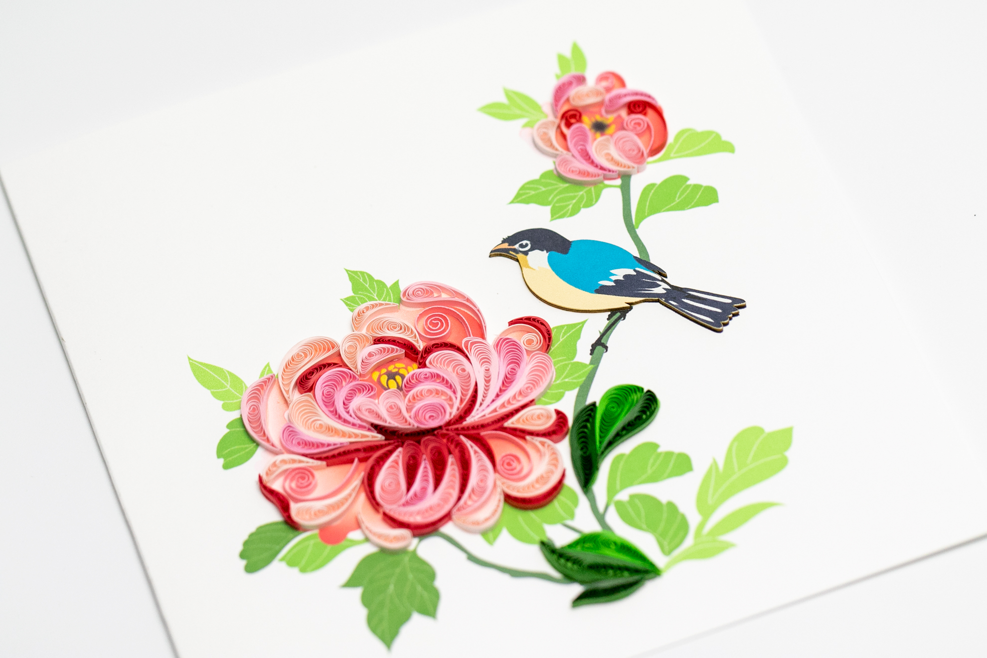 ✨Chim xanh đầu trên cành hoa mẫu đơn - Thiệp giấy xoắn 15 x 15 cm