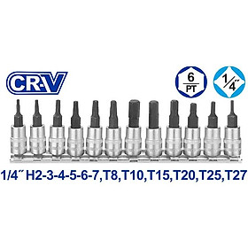 Bộ 12 đầu tuýp1/4" ra đầu vít lụ giác, sao Bộ 12 đầu tuýp mũi 1/4''. Bao gồm: 6 đầu tuýp 1/4" Dr. mũi lục giác: H2-3-4-5-6-7 6 đầu tuýp 1/4" Dr mũi lục giác bông size : T8,T10,T15,T20,T25,T27 Kích thước đầu tuýp: 1/4". Chất liệu mũi: Cr-V Chất liệu đầu tuýp: Thép 50BV30 (Cr-V) xử lý nhiệt, mạ crom.