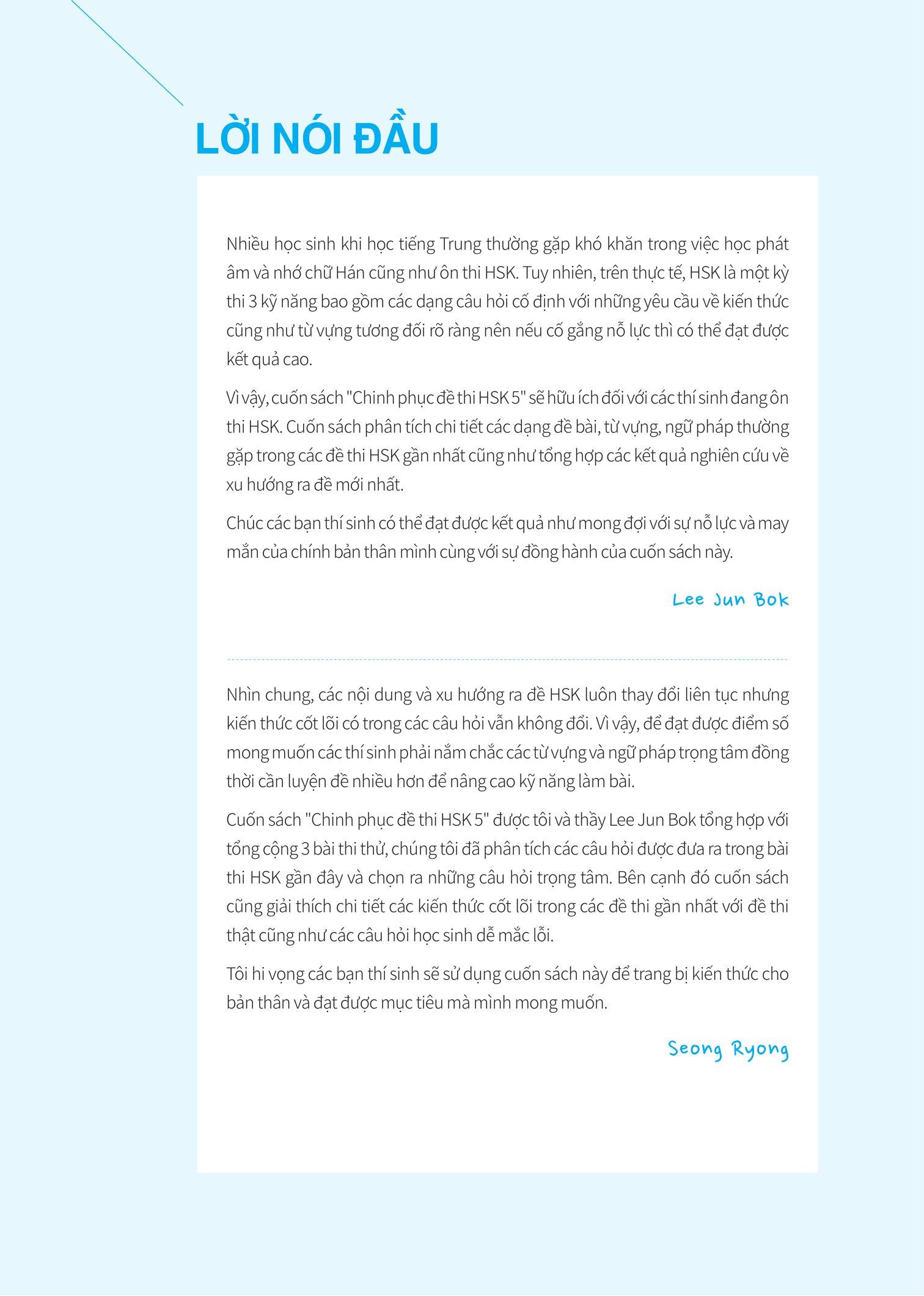 Ở phần đầu sách sẽ giới thiệu về đề thi HSK 5 bao gồm đối tượng dự thi, cấu trúc bài thi và phân bổ thời gian, những lưu ý trong thời gian thi, tiêu chuẩn để đạt yêu cầu và cách viết phiếu trả lời HSK 5