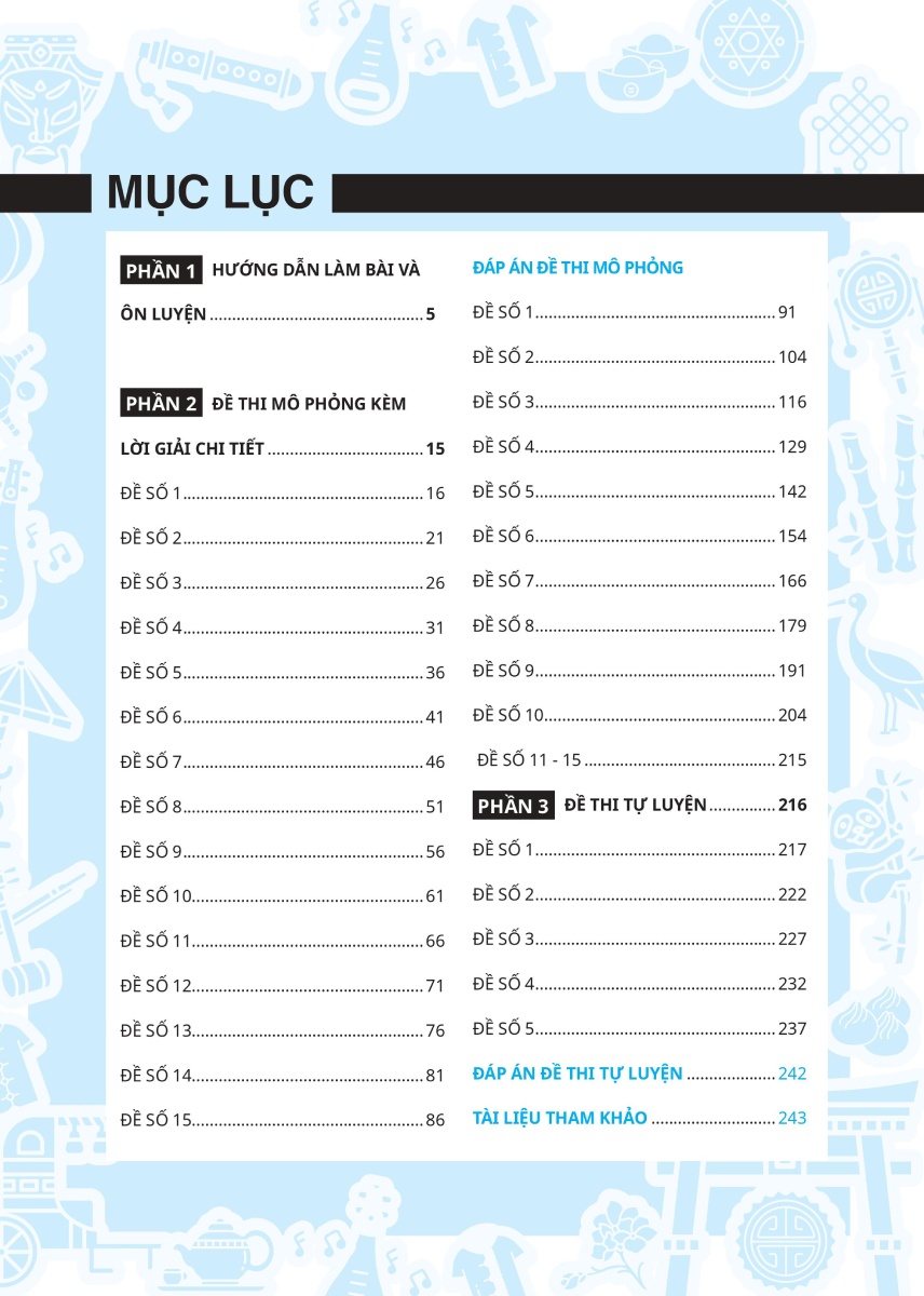 Để giúp bạn làm quen với đề thi thực tế và nâng cao kỹ năng làm bài, sách cung cấp 15 đề thi thực hành chất lượng cao. Bên cạnh đó, sách còn bao gồm 5 đề tự luyện kèm lời giải chi tiết, giúp bạn tự đánh giá, phân tích và cải thiện kết quả học tập của mình.