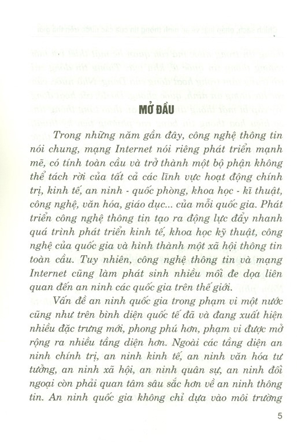Giới thiệu những chính sách, pháp luật của nhà nước trong đảm bảo an ninh thông tin; trình bày các học thuyết an ninh thông tin và khái lược một số văn bản pháp luật đảm bảo an ninh thông tin của Liên bang Nga; khái quát bối cảnh tình hình và giá trị tham khảo đối với Việt Nam