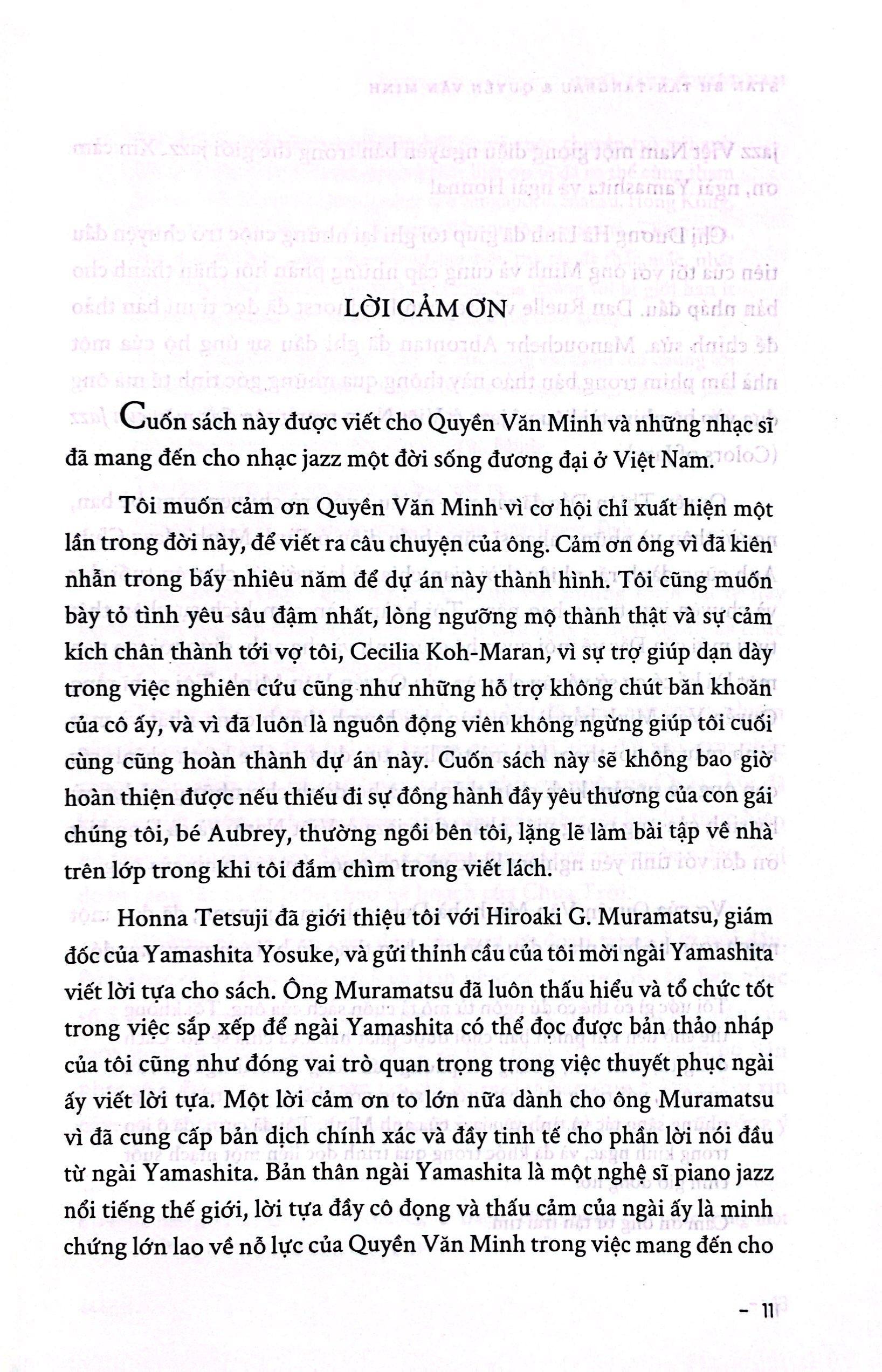Mua tại TiktokJazz - một thể loại âm nhạc bắt nguồn từ cộng đồng người châu Phi ở Hoa Kỳ vào cuối thế kỷ 19 - đầu thế kỷ 20, đã lan ra khắp thế giới và hiện diện ở mọi nền văn hóa âm nhạc quốc gia. Nhạc jazz mang đậm tính nghệ sĩ, đầy nét đặc trưng và khiến những thính giả khi đã thích rồi sẽ như một kẻ si tình với nó. Ở Việt Nam, jazz cũng có rất nhiều câu chuyện riêng, kiến thức “nhập môn” riêng để khám phá, như người Việt chơi jazz ở Việt Nam là ai? Họ học chơi jazz ở đâu, bằng cách nào? Có thật là họ “chơi jazz” không? Những câu hỏi ấy sẽ được giải đáp trong Chơi jazz ở Việt Nam: Quyền Văn Minh và nhạc jazz Hà Nội - cuốn sách kể lại cuộc hành trình jazz ra đời ở Việt Nam, tập trung vào câu chuyện của nghệ sĩ Quyền Văn Minh - người đã tận hiến đời mình cho việc phát triển jazz ở mảnh đất quê hương, để thuật lại sống động cách mà nhạc jazz được nghe, được học và được biểu diễn ở nơi này. Không phải một bài phỏng vấn tiêu chuẩn mà ta vẫn thường đọc trên báo chí, nội dung cuốn sách như góp nhặt từ những lần ngồi xuống tâm tình, hàn huyên cùng một người bạn đáng tin cậy, để từ chuyện đời mà nghe ra chuyện nhạc, chuyện jazz. Tác phẩm là bước đệm cho những nghiên cứu và hiểu biết sâu hơn về nhạc jazz ở Việt Nam. ĐÁNH GIÁ/NHẬN XÉT CỦA CHUYÊN GIA “Đây là cuốn sách mà những người yêu âm nhạc trên toàn cầu không thể bỏ lỡ”. - Yamashita Yosuke TRÍCH ĐOẠN HAY