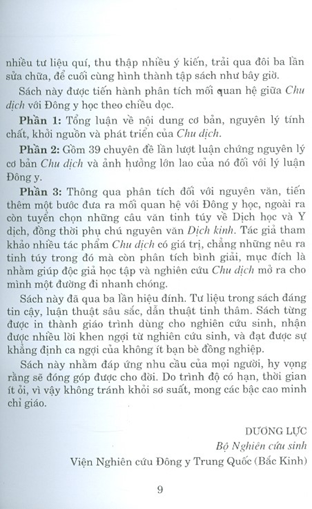 Chu Dịch có ý nghĩa sâu rộng, là nền cơ bản của khoa học tự nhiên, là sự uyên thâm của nhiều khoa học; các môn khoa học Trung Quốc đều khởi nguồn từ Chu Dịch. Đông y làm một bộ phận của khoa học tự nhiên, có mối quan hệ không thể tách rời với Chu Dịch. Chu Dịch ngày càng được mọi người trong và ngoài nước coi trọng. Một cơn sốt Chu Dịch đang bắt đầu, thế mà sách vở về Chu Dịch rất ít, không đủ đáp ứng yêu cầu và mong mỏi của mọi người. Vì vậy, tác giả đã tham khảo nhiều tư liệu quý, thu thập nhiều ý kiến để cuối cùng hình thành tập sách như bây giờ. Sách này được tiến hành phân tích mối quan hệ giữa Chu Dịch với Đông y học theo chiều dọc.