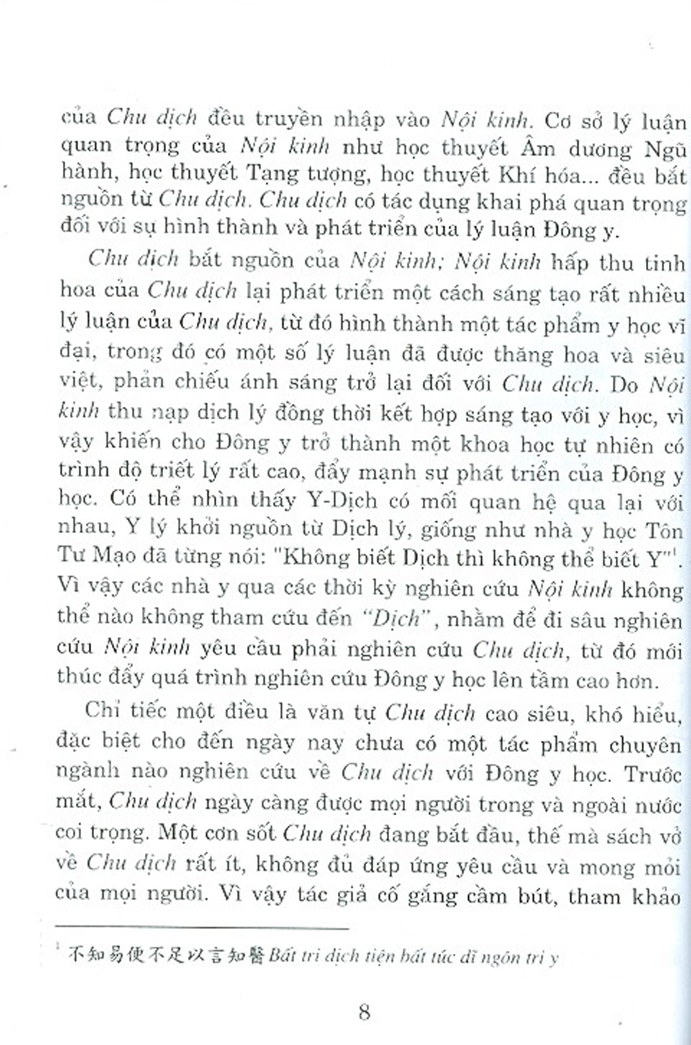 Các sách y học đời trước đều cho rằng:" Không học Dịch thì đừng nói tới chuyện Y học ", " Dịch có lý lẽ của Y, Y được dùng bởi Dịch ".