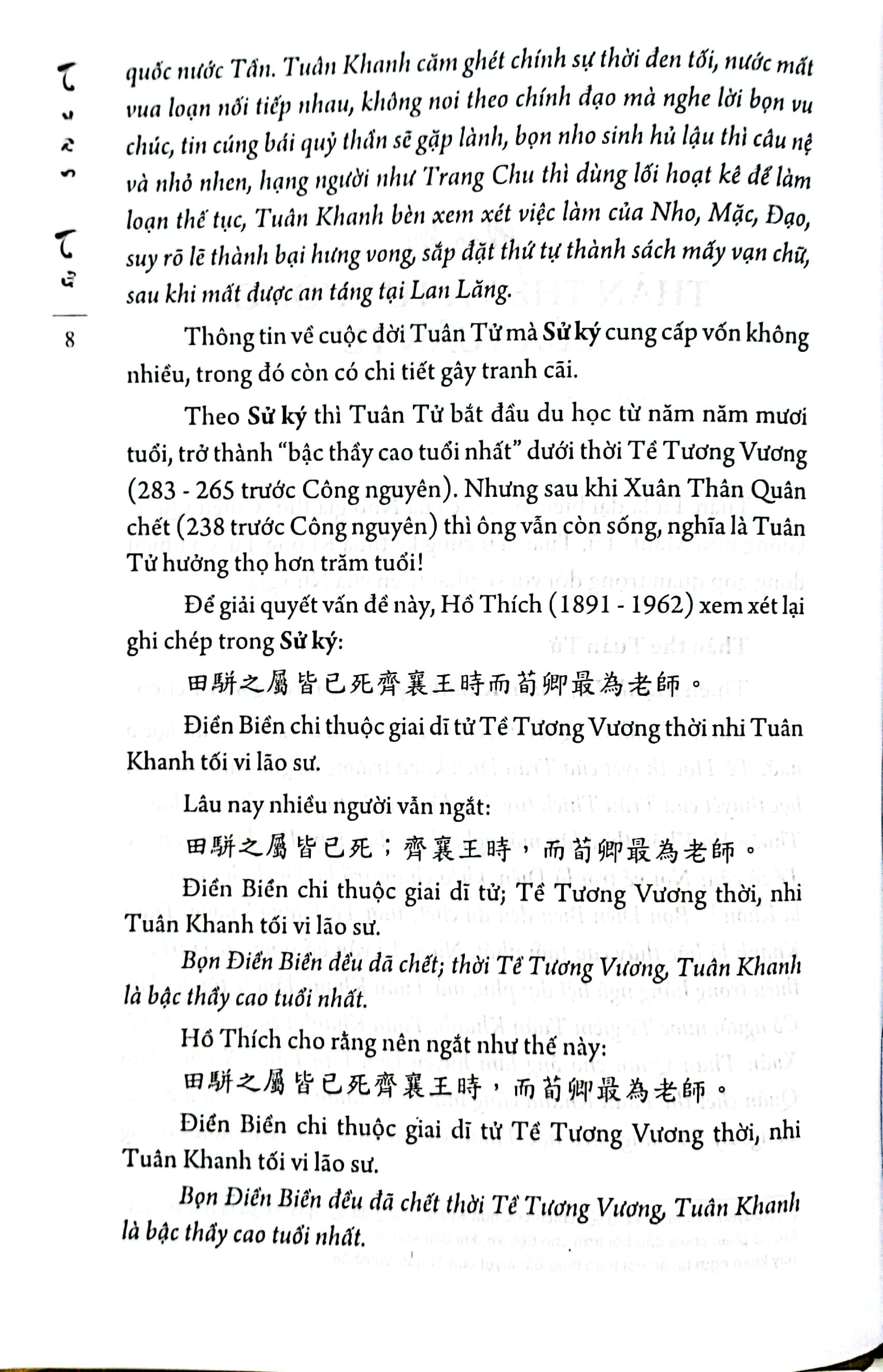 Trong cuốn sách này, lần đầu tiên bộ “Tuân Tử” được biên dịch đầy đủ sang tiếng Việt, kèm theo lời chú thích của nhiều học giả danh tiếng như Dương Lượng, Hác Ý Hành, Vương Tiên Khiêm, Lưu Sư Bồi,… Xin trân trọng giới thiệu cùng độc giả!