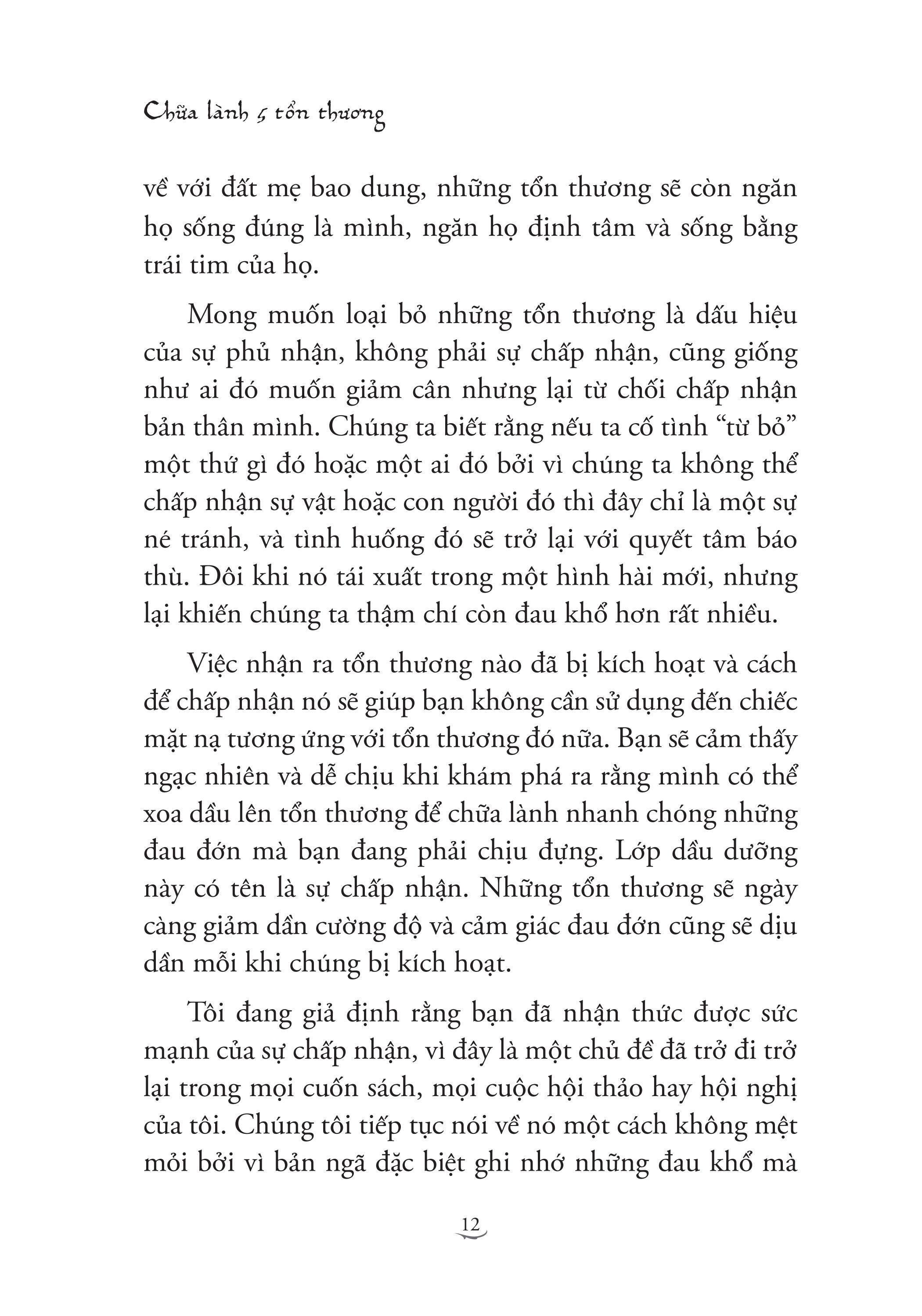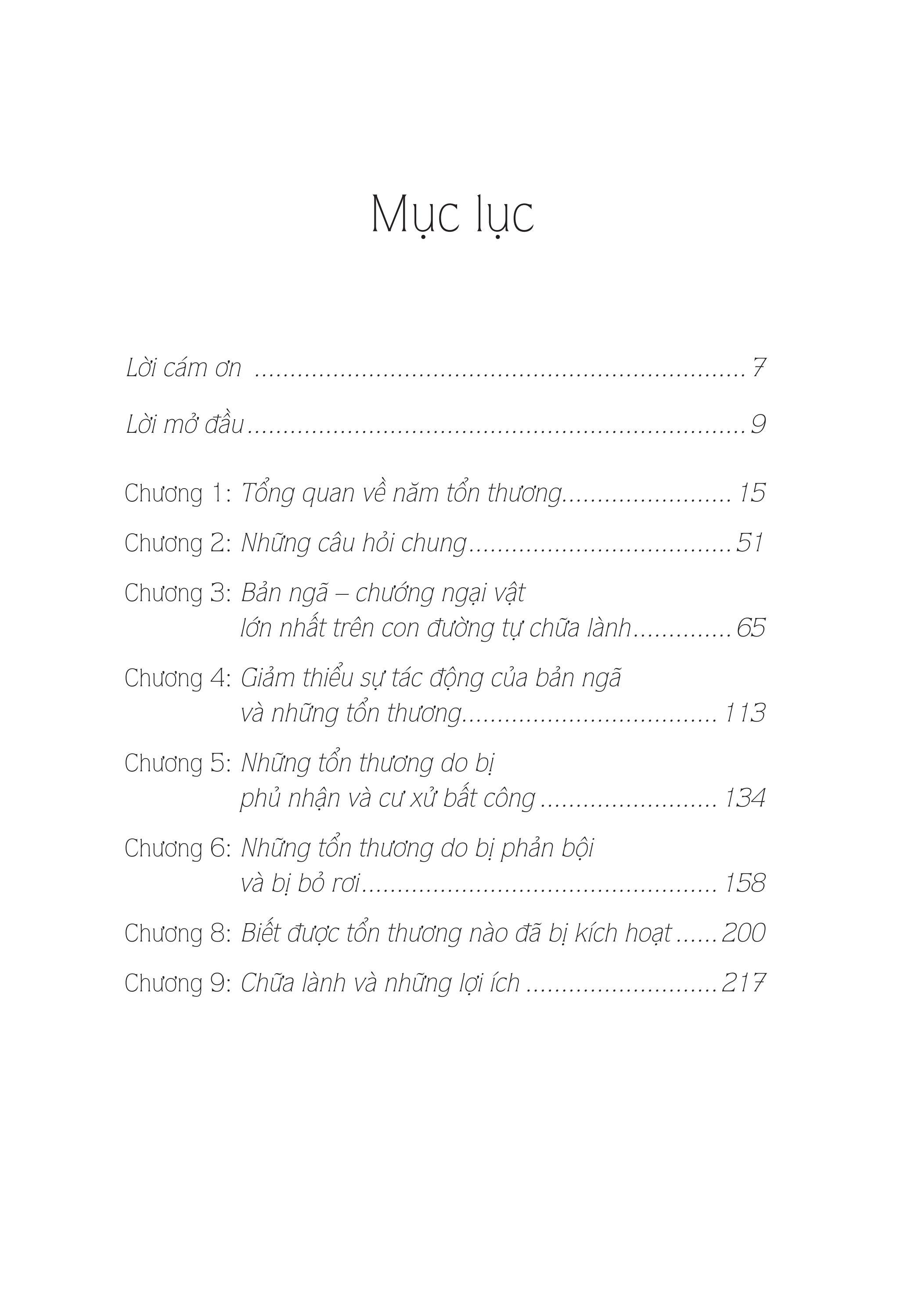 Trong cuốn sách này, bạn sẽ học được cách nhận ra cơ chế của những tổn thương và biết được khi nào thì chúng bị kích hoạt. Để chữa lành được tổn thương thì chúng ta nhất định phải nhận ra vô vàn các trường hợp mà cái tôi (mặt nạ nguỵ trang của chúng ta) dẫn dắt suy nghĩ, lời nói và hành động của chúng ta.