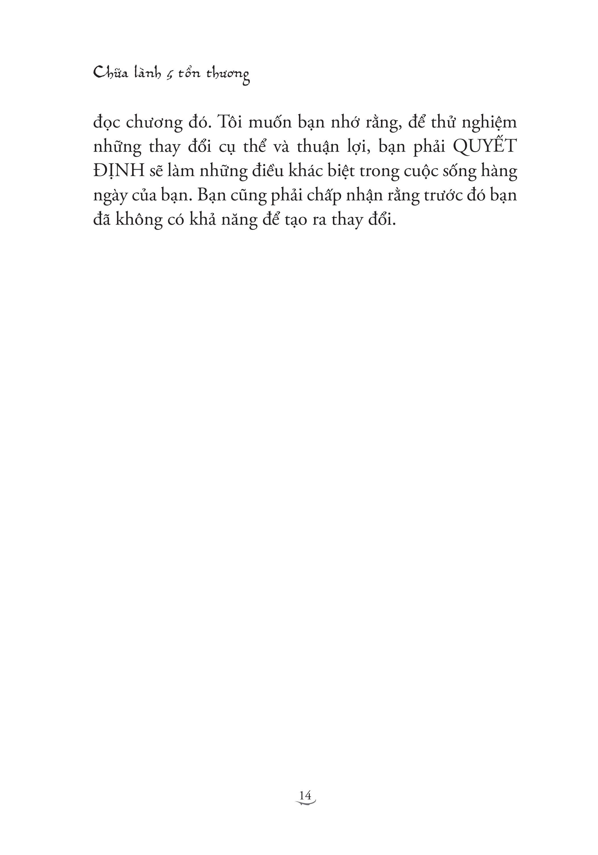 Trong khi áp dụng những gợi ý được đưa ra trong cuốn sách này, bạn sẽ nhận ra tác động của những tổn thương này sẽ giảm dần và từng chút một bạn sẽ làm chủ cuộc sống của m.ình. Và điều này cho phép bạn bộc lộ những nhu cầu căn bản nhất của linh hồn m.ình và đạt được bình yên trong tâm hồn.