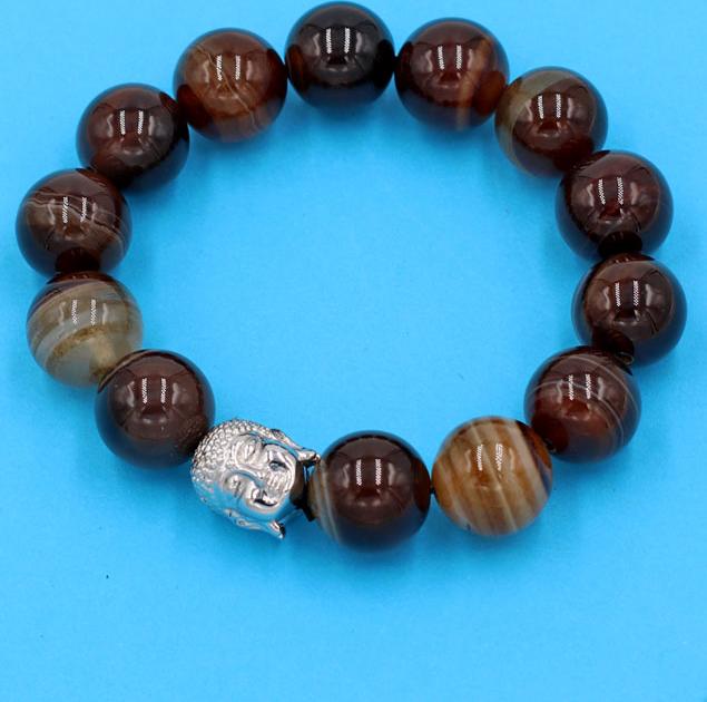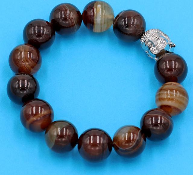 ✨Chuỗi tay mã não nâu sọc 14 ly - cẩn hạt Như Lai Inox trắng VMNNSNLT14 - hợp mệnh Kim, mệnh Thổ
