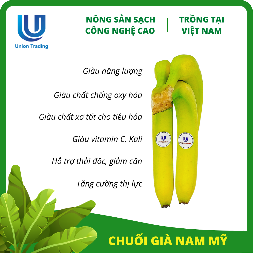 Công ty TNHH TMDV Union Trading được thành lập năm 2017, trải qua hơn 5 năm nỗ lực phát triển nghiêm túc, đầu tư bài bản, đến nay công ty đã sở hữu nông trại chuối Cavendish (chuối già giống Nam Mỹ) cấy mô rộng 125 ha tại Hớn Quản, Bình Phước cùng mạng lưới nông trại hợp tác ở nhiều tỉnh thành Củ Chi, An Giang, Quảng Ngã với tổng diện tích lên đến 500 ha.