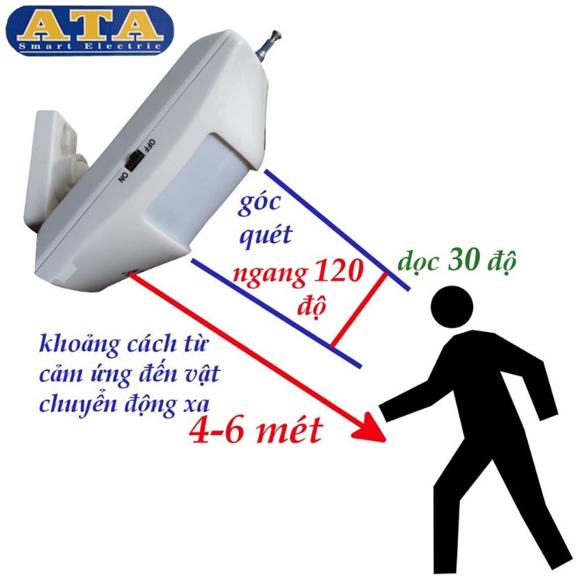 - Góc quét của cảm biến là khoảng 120 độ ngang - cao 30 độ , tầm quét xa đến người là từ 4- 6 mét . Lưu ý là cảm biến sẽ quét tất cả các chuyển động như : người , con vật như chó mèo , xe cộ di chuyển , cành cây rung mạnh … -1 chuông có thể kết hợp tối đa với 4 cảm biến . Ngoài ra chuông có thể kết hợp với nút nhấn của bộ AT913 hoặc AT916 hoặc kết hợp với cửa từ của AT332 Sản phẩm được kiểm tra ( thử ) 100 % trước khi giao hàng . LƯU Ý : Khi mắt cảm ứng có tình trạng báo giả nên kiểm tra xem pin có bị yếu hoặc hết pin hay không ? Điều chỉnh góc quét tránh những vật có thể gây báo giả như con vật ( chó mèo …) , cành lá cây rung mạnh. CÁCH KẾT HỢP CHUÔNG VÀ CẢM ỨNG 1.Cắm chuông vào ổ điện , nhấn giữ nút tăng giảm âm lượng khoảng 5 giây nghe thấy chuông kêu 2 tiếng tin tin thì thả tay ra . 2.Và ngay lập tức gạt công tắc trên cảm ứng từ OFF sang ON - hoặc quơ tay trên mặt cảm ứng nếu công tắc đang ở ON - đèn đỏ trên mặt cảm ứng phải chớp sáng lên . Khi đó chuông kêu lên 1 điệu nhạc là kết nối thành công